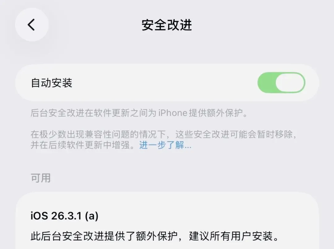 官方更新说明显示,本次后台安全改进为设备提供了额外的安全防护,苹果建议所有用户完成更新以保障设备安全。