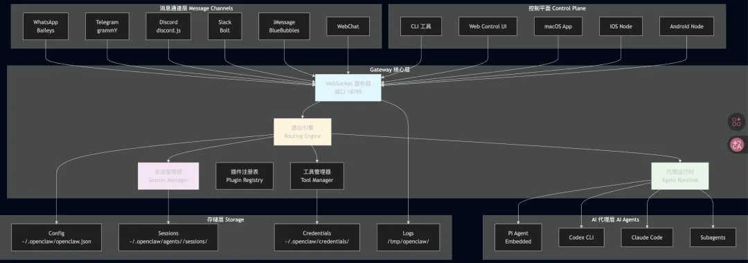graph TB subgraph "消息通道层 Message Channels" WA[WhatsApp<br/>Baileys] TG[Telegram<br/>grammY] DC[Discord<br/>discord.js] SL[Slack<br/>Bolt] IM[iMessage<br/>BlueBubbles] WX[WebChat] end subgraph "Gateway 核心层" direction TB WS[WebSocket 服务器<br/>端口 18789] RT[路由引擎<br/>Routing Engine] SM[会话管理器<br/>Session Manager] TM[工具管理器<br/>Tool Manager] PM[插件注册表<br/>Plugin Registry] AM[代理运行时<br/>Agent Runtime] end subgraph "控制平面 Control Plane" CLI[CLI 工具] WEB[Web Control UI] MAC[macOS App] IOS[iOS Node] AND[Android Node] end subgraph "AI 代理层 AI Agents" PI[Pi Agent<br/>Embedded] CX[Codex CLI] CC[Claude Code] SA[Subagents] end subgraph "存储层 Storage" CFG[Config<br/>~/.openclaw/openclaw.json] SES[Sessions<br/>~/.openclaw/agents/<id>/sessions/] CRD[Credentials<br/>~/.openclaw/credentials/] LOG[Logs<br/>/tmp/openclaw/] end WA --> WS TG --> WS DC --> WS SL --> WS IM --> WS WX --> WS WS --> RT RT --> SM RT --> TM RT --> AM CLI --> WS WEB --> WS MAC --> WS IOS --> WS AND --> WS AM --> PI AM --> CX AM --> CC AM --> SA SM --> SES TM --> CRD RT --> CFG WS --> LOG style WS fill:#e1f5fe style RT fill:#fff3e0 style SM fill:#f3e5f5 style AM fill:#e8f5e91.3 核心组件职责
