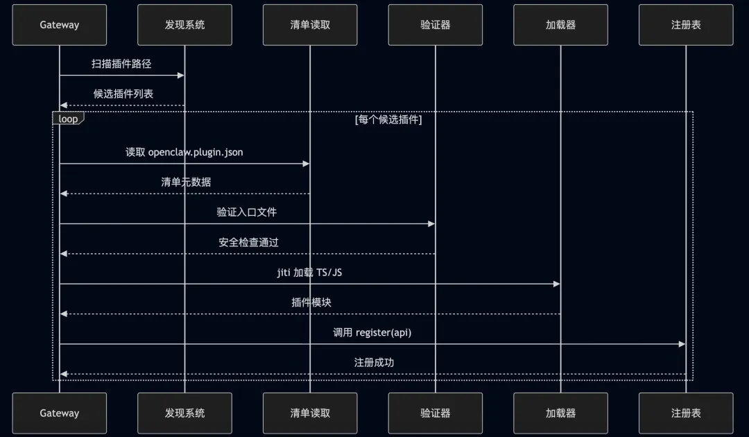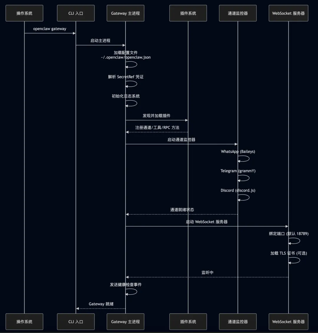 sequenceDiagram participant OS as 操作系统 participant CLI as CLI 入口 participant GW as Gateway 主进程 participant PL as 插件系统 participant CH as 通道监控器 participant WS as WebSocket 服务器 OS->>CLI: openclaw gateway CLI->>GW: 启动主进程 GW->>GW: 加载配置文件<br/>~/.openclaw/openclaw.json GW->>GW: 解析 SecretRef 凭证 GW->>GW: 初始化日志系统 GW->>PL: 发现并加载插件 PL-->>GW: 注册通道/工具/RPC 方法 GW->>CH: 启动通道监控器 CH->>CH: WhatsApp (Baileys) CH->>CH: Telegram (grammY) CH->>CH: Discord (discord.js) CH-->>GW: 通道就绪状态 GW->>WS: 启动 WebSocket 服务器 WS->>WS: 绑定端口 (默认 18789) WS->>WS: 加载 TLS 证书 (可选) WS-->>GW: 监听中 GW->>GW: 发送健康检查事件 GW-->>CLI: Gateway 就绪2.2 配置加载与验证