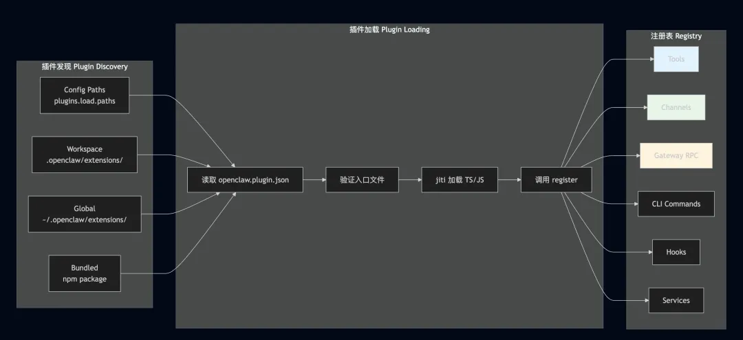 插件系统是 OpenClaw 扩展性的核心。所有功能(通道、工具、RPC 方法、CLI 命令)都通过插件注册表统一管理。