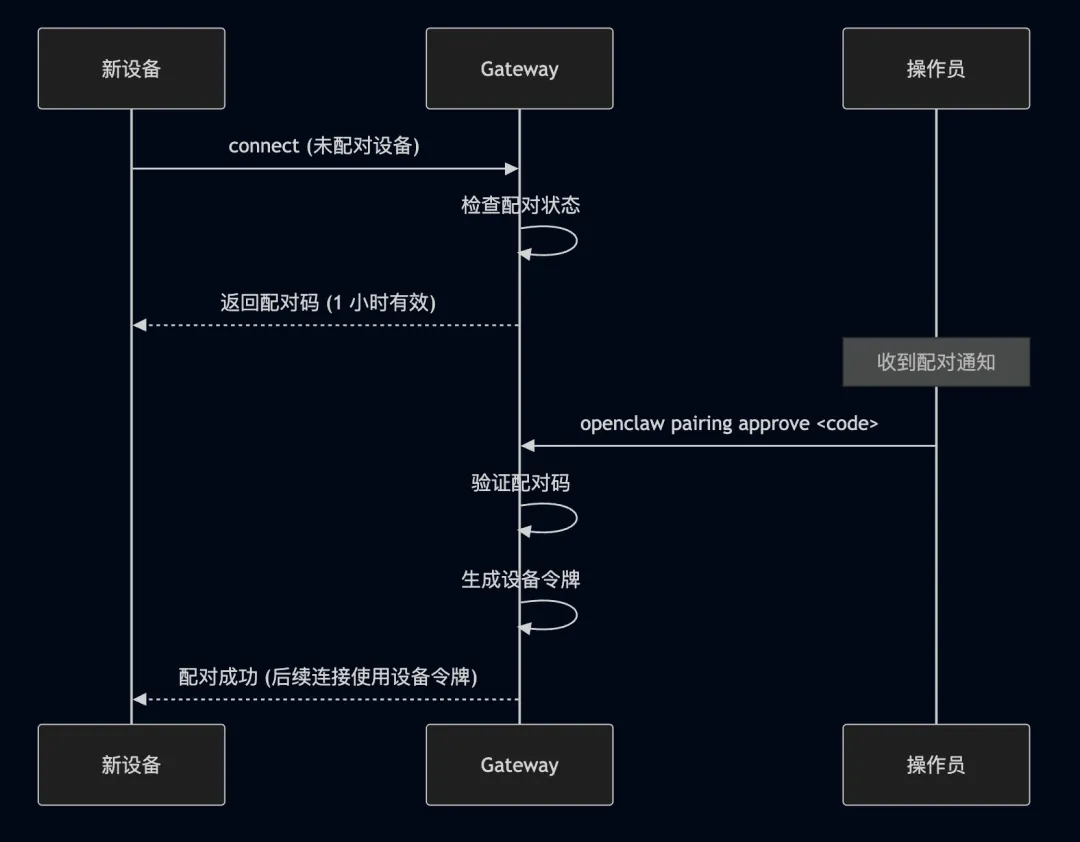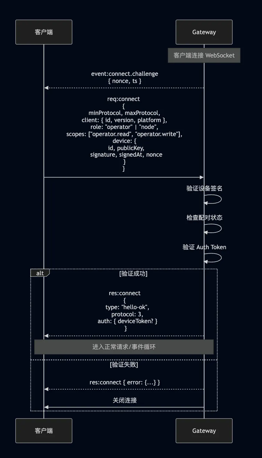 sequenceDiagram participant Client as 客户端 participant GW as Gateway Note over GW: 客户端连接 WebSocket GW-->>Client: event:connect.challenge<br/>{ nonce, ts } Client->>GW: req:connect<br/>{<br/> minProtocol, maxProtocol,<br/> client: { id, version, platform },<br/> role: "operator" | "node",<br/> scopes: ["operator.read", "operator.write"],<br/> device: {<br/> id, publicKey,<br/> signature, signedAt, nonce<br/> }<br/>} GW->>GW: 验证设备签名 GW->>GW: 检查配对状态 GW->>GW: 验证 Auth Token alt 验证成功 GW-->>Client: res:connect<br/>{<br/> type: "hello-ok",<br/> protocol: 3,<br/> auth: { deviceToken? }<br/> } Note over Client,GW: 进入正常请求/事件循环 else 验证失败 GW-->>Client: res:connect { error: {...} } GW->>Client: 关闭连接 end握手请求示例: