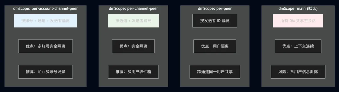 单用户场景: main(保持上下文连续性)多用户共享收件箱: per-channel-peer(防止跨用户信息泄露)多账号企业部署: per-account-channel-peer