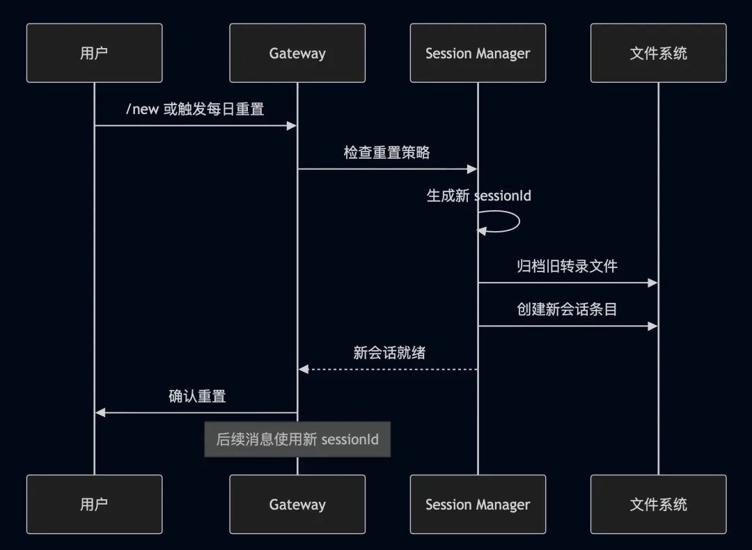 sequenceDiagram participant User as 用户 participant GW as Gateway participant SM as Session Manager participant FS as 文件系统 User->>GW: /new 或触发每日重置 GW->>SM: 检查重置策略 SM->>SM: 生成新 sessionId SM->>FS: 归档旧转录文件 SM->>FS: 创建新会话条目 SM-->>GW: 新会话就绪 GW->>User: 确认重置 Note over GW: 后续消息使用新 sessionId4.5 会话维护