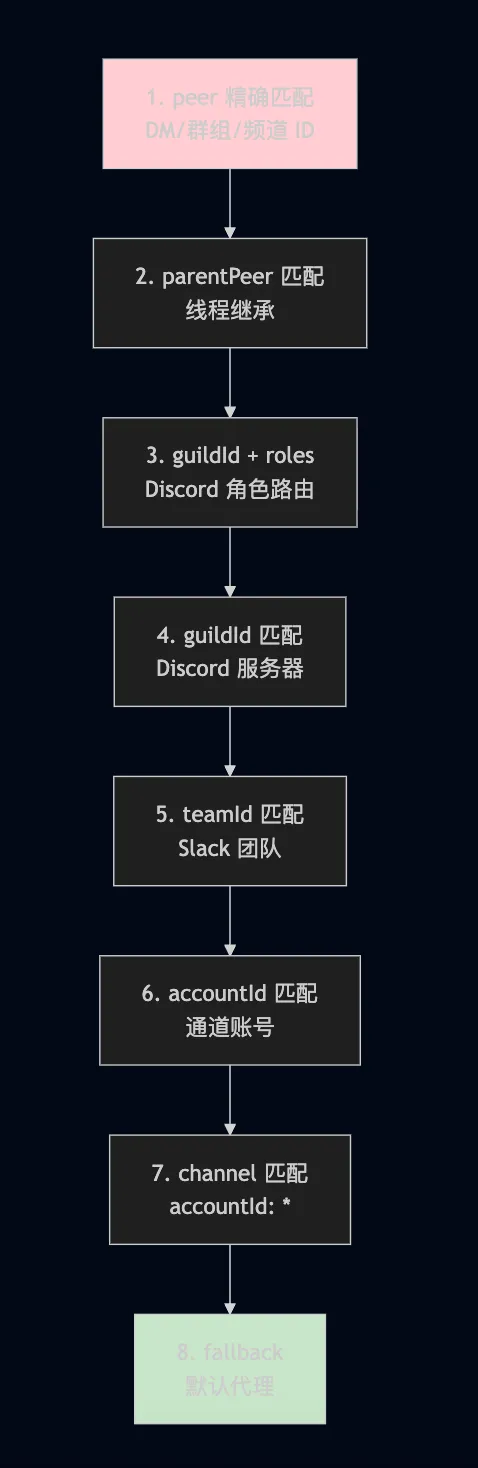 graph TB P1[1. peer 精确匹配<br/>DM/群组/频道 ID] P2[2. parentPeer 匹配<br/>线程继承] P3[3. guildId + roles<br/>Discord 角色路由] P4[4. guildId 匹配<br/>Discord 服务器] P5[5. teamId 匹配<br/>Slack 团队] P6[6. accountId 匹配<br/>通道账号] P7[7. channel 匹配<br/>accountId: "*"] P8[8. fallback<br/>默认代理] P1 --> P2 --> P3 --> P4 --> P5 --> P6 --> P7 --> P8 style P1 fill:#ffcdd2 style P8 fill:#c8e6c9绑定配置示例: