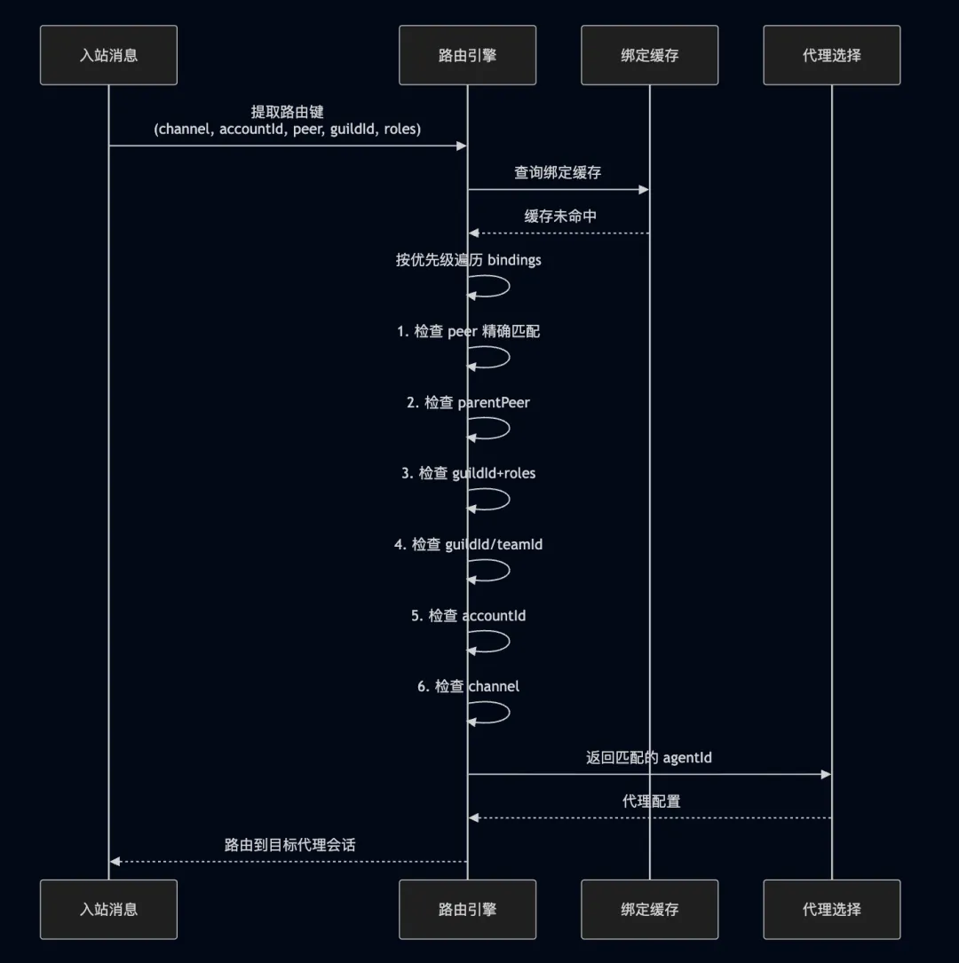 sequenceDiagram participant Msg as 入站消息 participant RE as 路由引擎 participant BC as 绑定缓存 participant AG as 代理选择 Msg->>RE: 提取路由键<br/>(channel, accountId, peer, guildId, roles) RE->>BC: 查询绑定缓存 BC-->>RE: 缓存未命中 RE->>RE: 按优先级遍历 bindings RE->>RE: 1. 检查 peer 精确匹配 RE->>RE: 2. 检查 parentPeer RE->>RE: 3. 检查 guildId+roles RE->>RE: 4. 检查 guildId/teamId RE->>RE: 5. 检查 accountId RE->>RE: 6. 检查 channel RE->>AG: 返回匹配的 agentId AG-->>RE: 代理配置 RE-->>Msg: 路由到目标代理会话5.4 代理间隔离