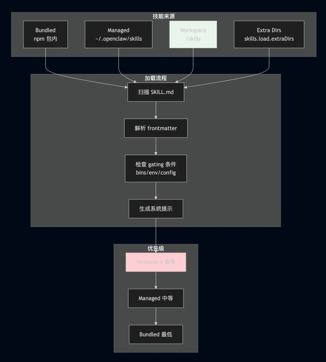 { agents: { list: [ { id: "personal", sandbox: { mode: "off" }, // 无沙箱,完全访问 tools: { // 无限制,所有工具可用 } }, { id: "family", sandbox: { mode: "all", scope: "agent", docker: { setupCommand: "apt-get update && apt-get install -y git curl" } }, tools: { allow: ["read", "exec"], deny: ["write", "edit", "apply_patch", "browser", "nodes", "cron"] } }, { id: "public", sandbox: { mode: "all", workspaceAccess: "none" }, tools: { allow: ["telegram", "whatsapp", "sessions_list"], deny: ["exec", "read", "write", "browser", "gateway", "cron"] } } ] }}6. 工具与技能系统