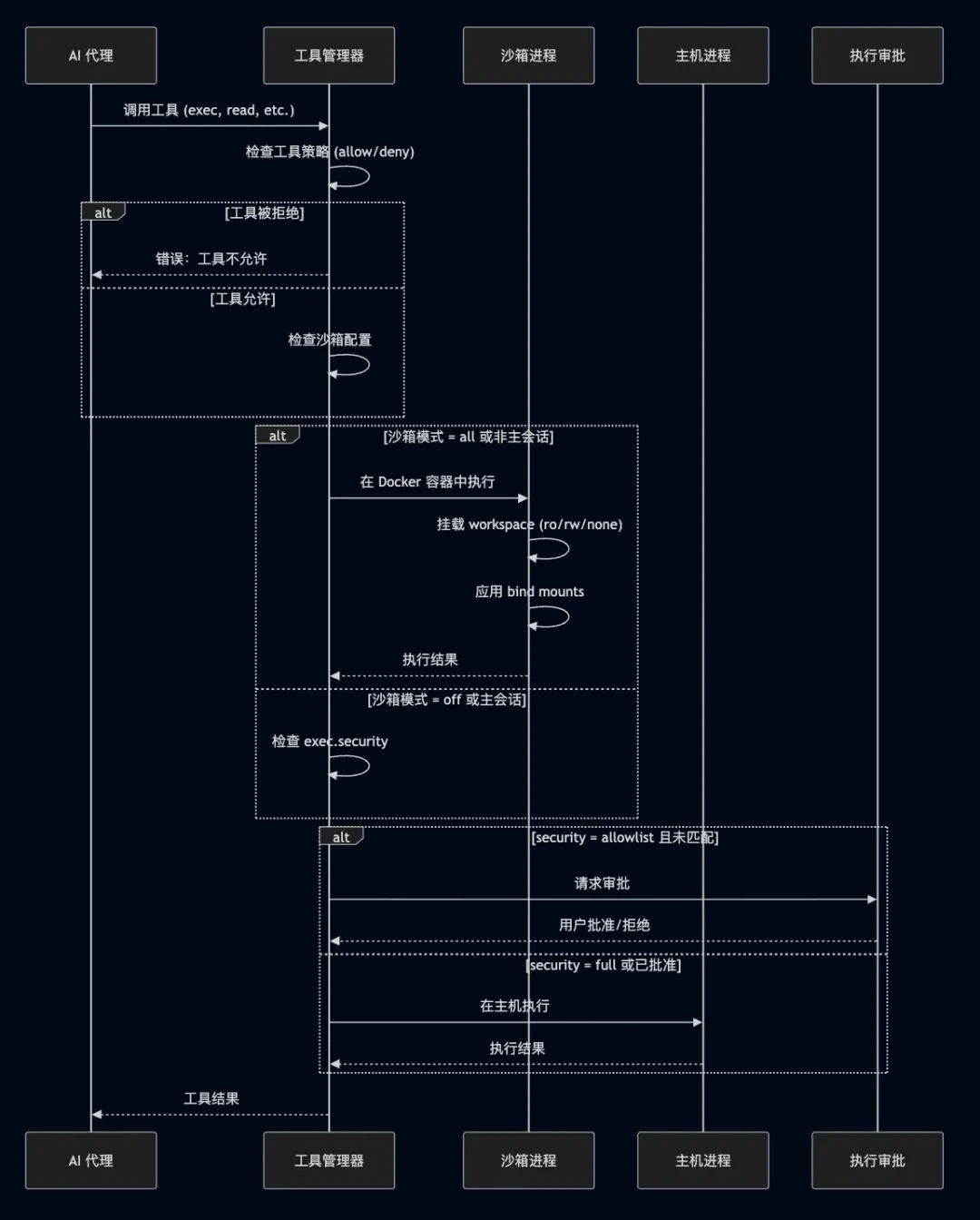 { tools: { agentToAgent: { enabled: true, allow: ["personal", "work"] // 允许互相调用的代理 } }}5.5 每代理沙箱与工具配置