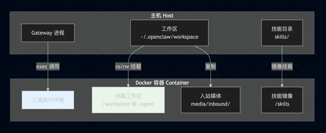 { // 网络绑定:仅本地回环 gateway: { mode: "local", bind: "loopback", port: 18789, auth: { mode: "token", token: "${GATEWAY_TOKEN}" // 长随机令牌 } }, // 会话隔离 session: { dmScope: "per-channel-peer" // 多用户场景 }, // 工具策略:最小权限 tools: { profile: "messaging", deny: ["gateway", "cron", "sessions_spawn", "sessions_send"], fs: { workspaceOnly: true }, exec: { security: "deny", ask: "always" }, elevated: { enabled: false } }, // 通道策略:严格准入 channels: { whatsapp: { dmPolicy: "pairing", groups: { "*": { requireMention: true } } }, telegram: { dmPolicy: "pairing", groups: { "*": { requireMention: true } } } }, // 沙箱:非主会话启用 agents: { defaults: { sandbox: { mode: "non-main", scope: "agent", workspaceAccess: "none" } } }}12.2 Docker 部署