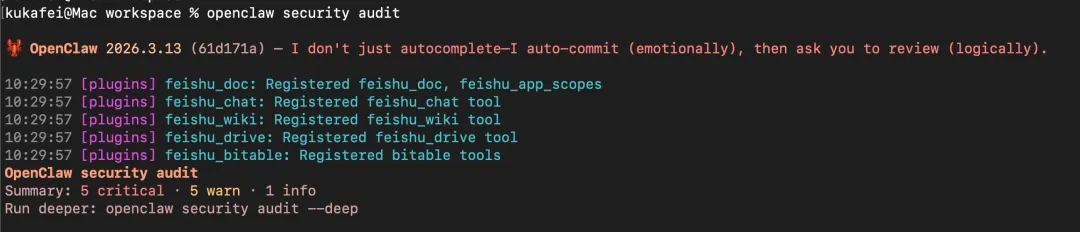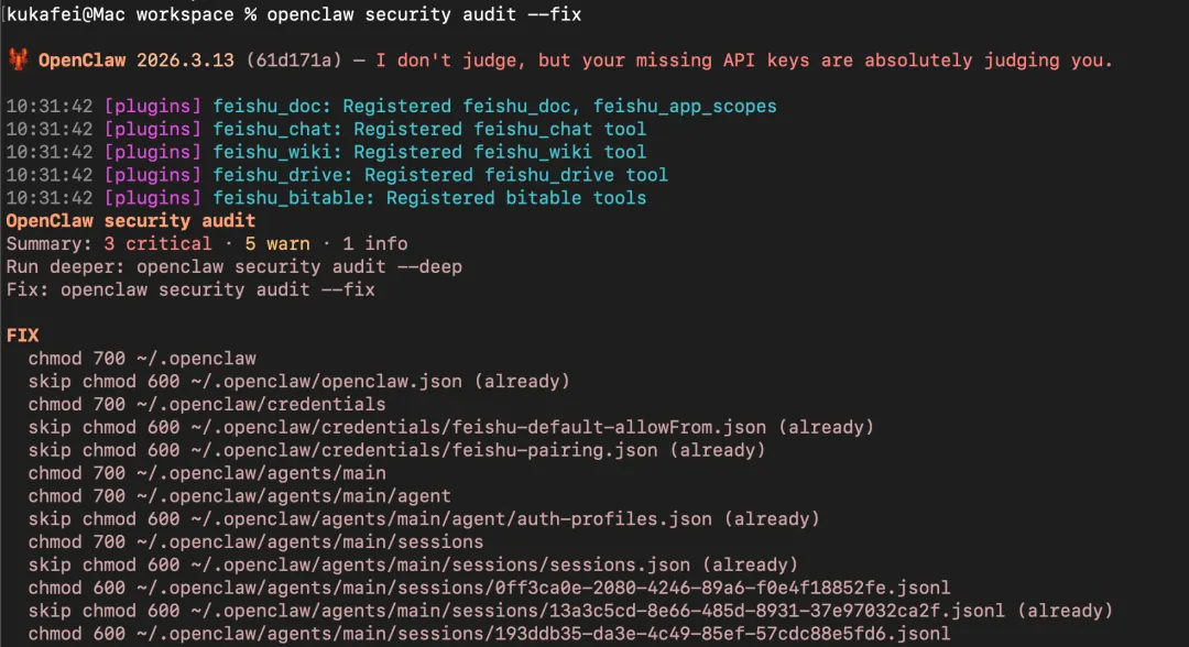 # 运行审计openclaw security audit# 深度审计(包含实时 Gateway 探测)openclaw security audit --deep# 自动修复openclaw security audit --fix# JSON 输出(用于自动化)openclaw security audit --json