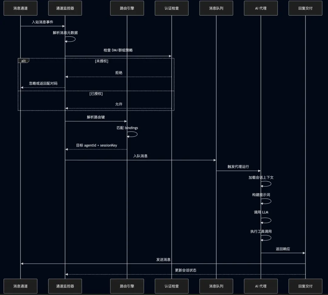 sequenceDiagram participant Channel as 消息通道 participant Monitor as 通道监控器 participant Router as 路由引擎 participant Auth as 认证检查 participant Queue as 消息队列 participant Agent as AI 代理 participant Reply as 回复交付 Channel->>Monitor: 入站消息事件 Monitor->>Monitor: 解析消息元数据 Monitor->>Auth: 检查 DM/群组策略 alt 未授权 Auth-->>Monitor: 拒绝 Monitor-->>Channel: 忽略或返回配对码 else 已授权 Auth-->>Monitor: 允许 end Monitor->>Router: 解析路由键 Router->>Router: 匹配 bindings Router-->>Monitor: 目标 agentId + sessionKey Monitor->>Queue: 入队消息 Queue->>Agent: 触发代理运行 Agent->>Agent: 加载会话上下文 Agent->>Agent: 构建提示词 Agent->>Agent: 调用 LLM Agent->>Agent: 执行工具调用 Agent->>Reply: 返回响应 Reply->>Channel: 发送消息 Reply-->>Monitor: 更新会话状态10.2 出站消息交付