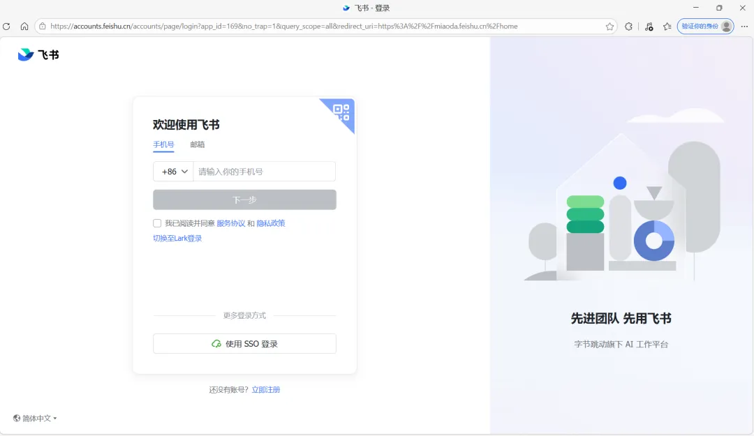 登录或注册飞书账号:若已有飞书账号,直接输入账号密码登录;若未注册,按照页面指引完成手机号验证、账号注册,确保账号处于正常使用状态。