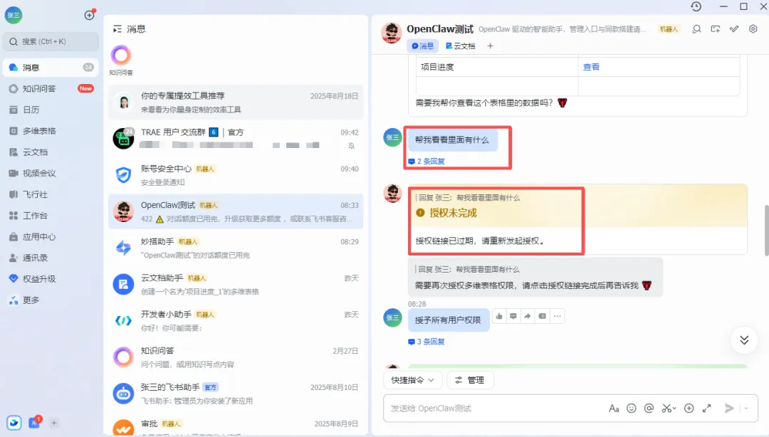 打开飞书应用(需下载安装 ),尝试通过 OpenClaw 机器人执行文档创建、内容读取等操作,此时页面会自动弹出授权提示按钮。