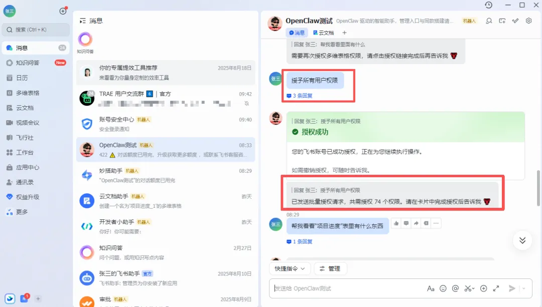 如果不想要每次都进行授权,在飞书对话框中输入指令“受予所有用户权限”。系统将自动为当前账号及关联用户授予 OpenClaw 操作飞书的全部权限。