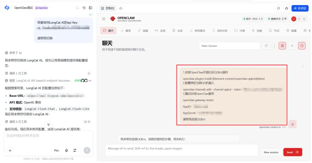 切换 API 配置:返回飞书网页版,通过左侧 “飞书妙搭机器人” 对话窗口,输入指令“我要使用 LongCat AI 的 api Key:【粘贴你的 API Key】,请帮我切换”,机器人将自动完成 API 密钥替换与配置。