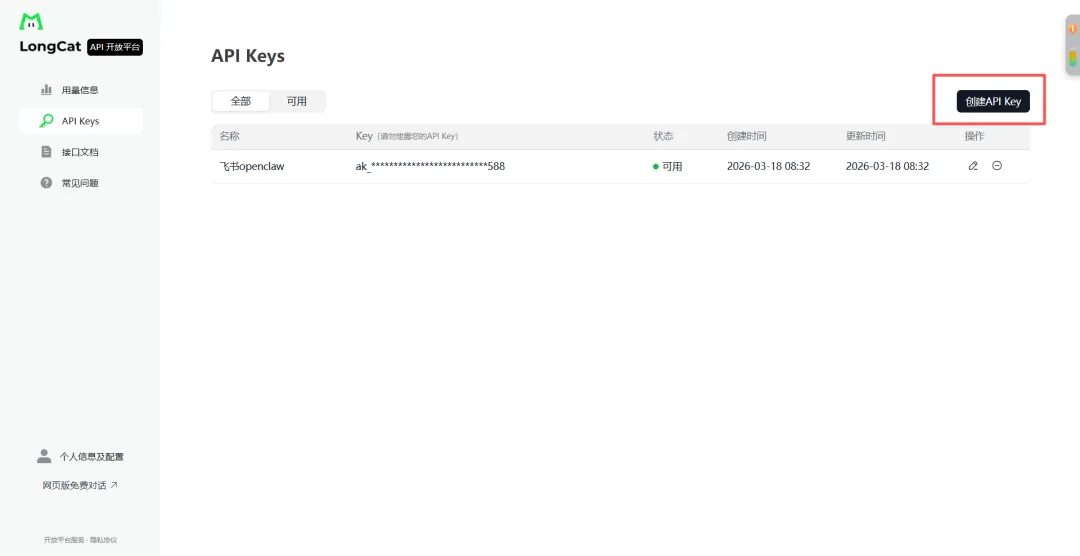 创建 API 密钥:在平台页面中找到 “API Keys” 选项,点击 “创建 API Key”,系统生成专属密钥后,复制并妥善保存。
