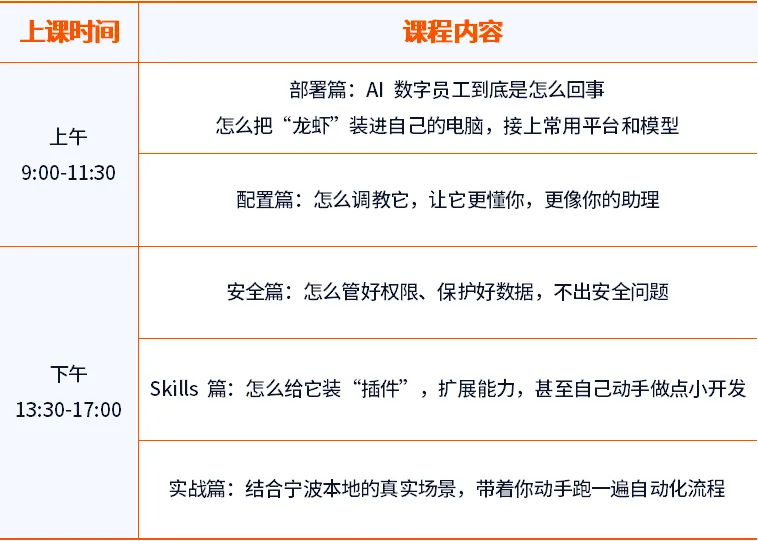 “龙虾”的能力来自于Skill(技能)——准确说,是那些可以被它调用的API接口、代码模块、操作指令。我们的课程会带你逐一拆解:邮件收发、数据抓取、服务器监控……每个场景对应什么技能,怎么装、怎么配、怎么用。