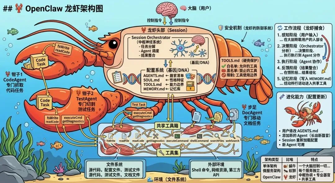 那龙虾是怎么有很强的动手能力的呢?这里的skill其实就是解决某一个问题的操作手册。龙虾就是把操作手册以及现在的会话信息一股脑告诉大模型,然后大模型就回复了一个指令:用xxx的方式去做xx,然后龙虾就跟节肢动物一样屁颠屁颠地去执行了。那既然是一个操作手册,其实任何龙虾都是可以执行的,就好比黑客帝国里演的一样,脑袋上接了一根线,就可以生成新能力。龙虾的员工:专业团队