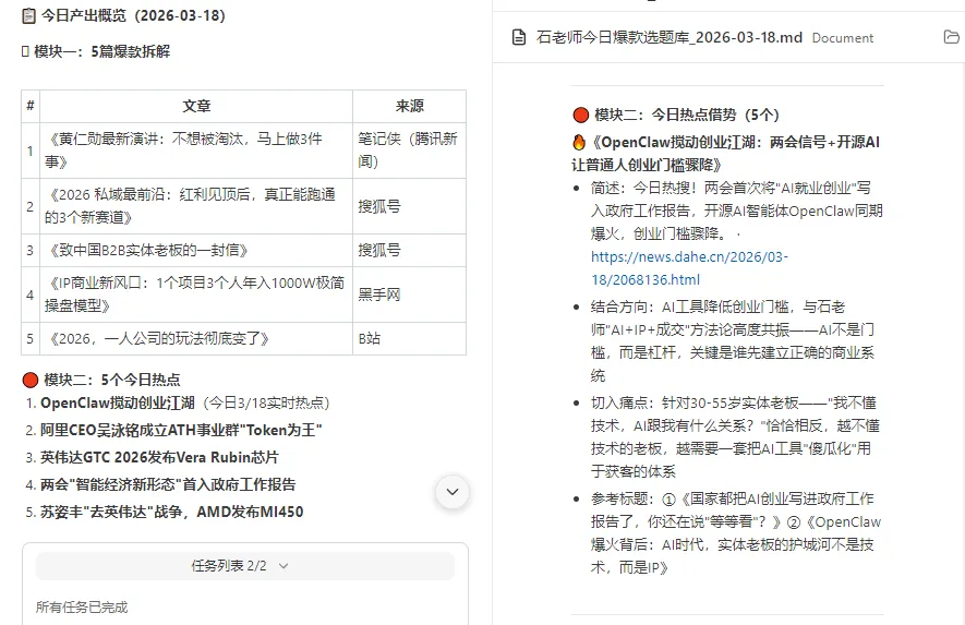 比如今天这篇文章,就是我的AI员工"帮我"生成今日选题库之后,我选了这个方向来写的。