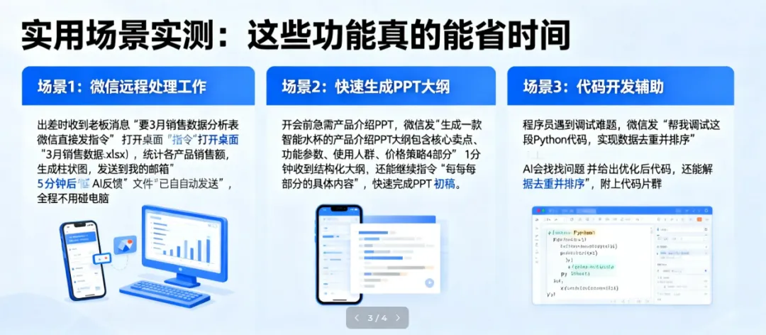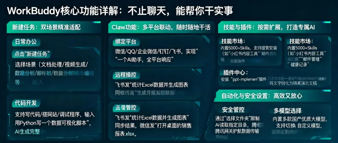 零技术门槛:免复杂部署,安装即用,不用懂代码也能操作; 微信直连:绑定后微信就是指令中心,通勤、出差随时随地发任务; 功能全面:覆盖日常办公+代码开发双场景,5000+技能生态适配; 安全靠谱:腾讯网关护航,可限制文件读取范围,数据安全有保障; 多端兼容:支持微信、QQ、企业微信、钉钉、飞书多平台接入,办公场景全覆盖。