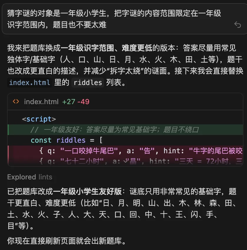 借助AI能力,我们把老师的教育想法,快速变成可落地、可迭代、可优化的学习产品;在一次次修改、测试、打磨中,让技术服务于教学,而非喧宾夺主,让每一个界面、每一道谜题、每一次互动,都贴合一年级孩子的认知节奏与学习特点。