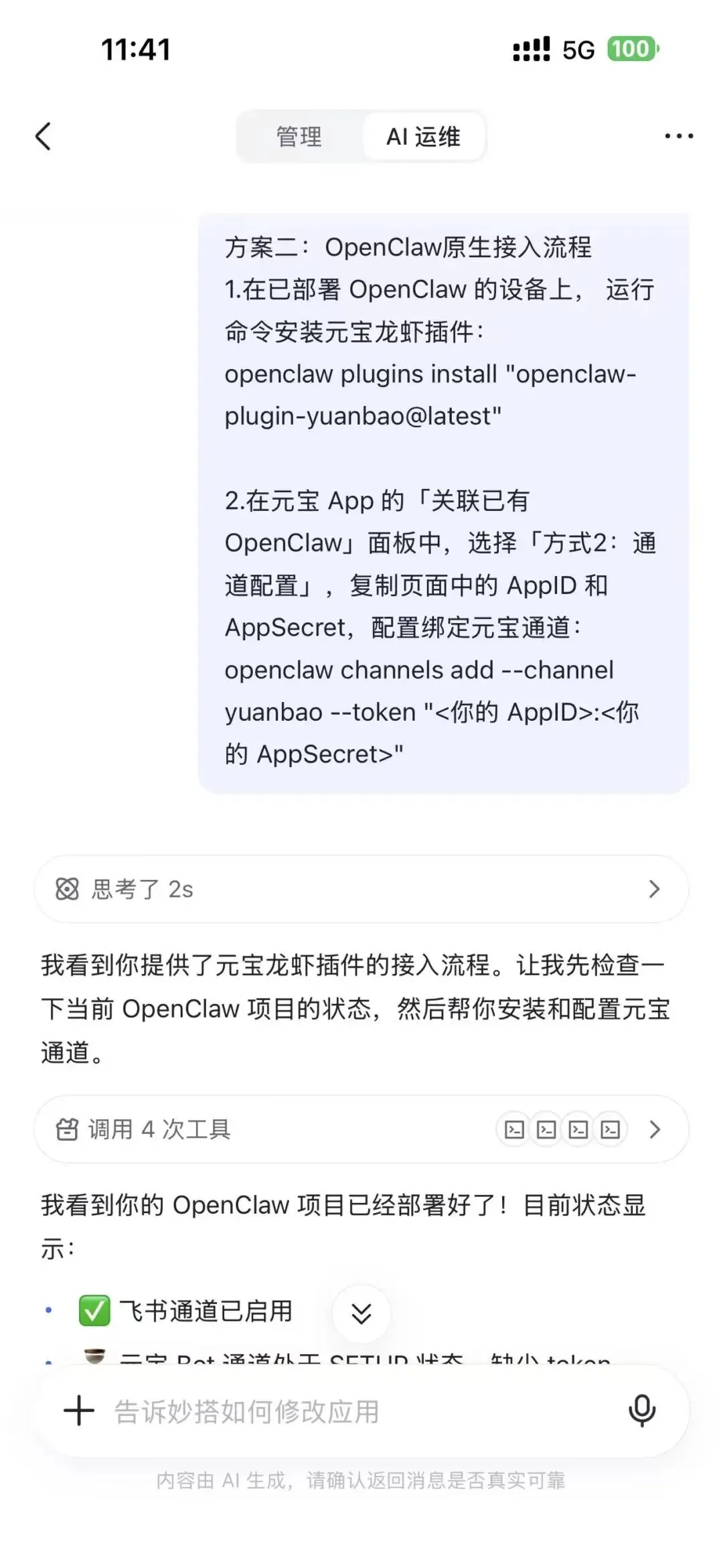 提示:接入完成后,你可以在元宝 App 中直接与 OpenClaw Agent 对话,享受更便捷的操作体验!