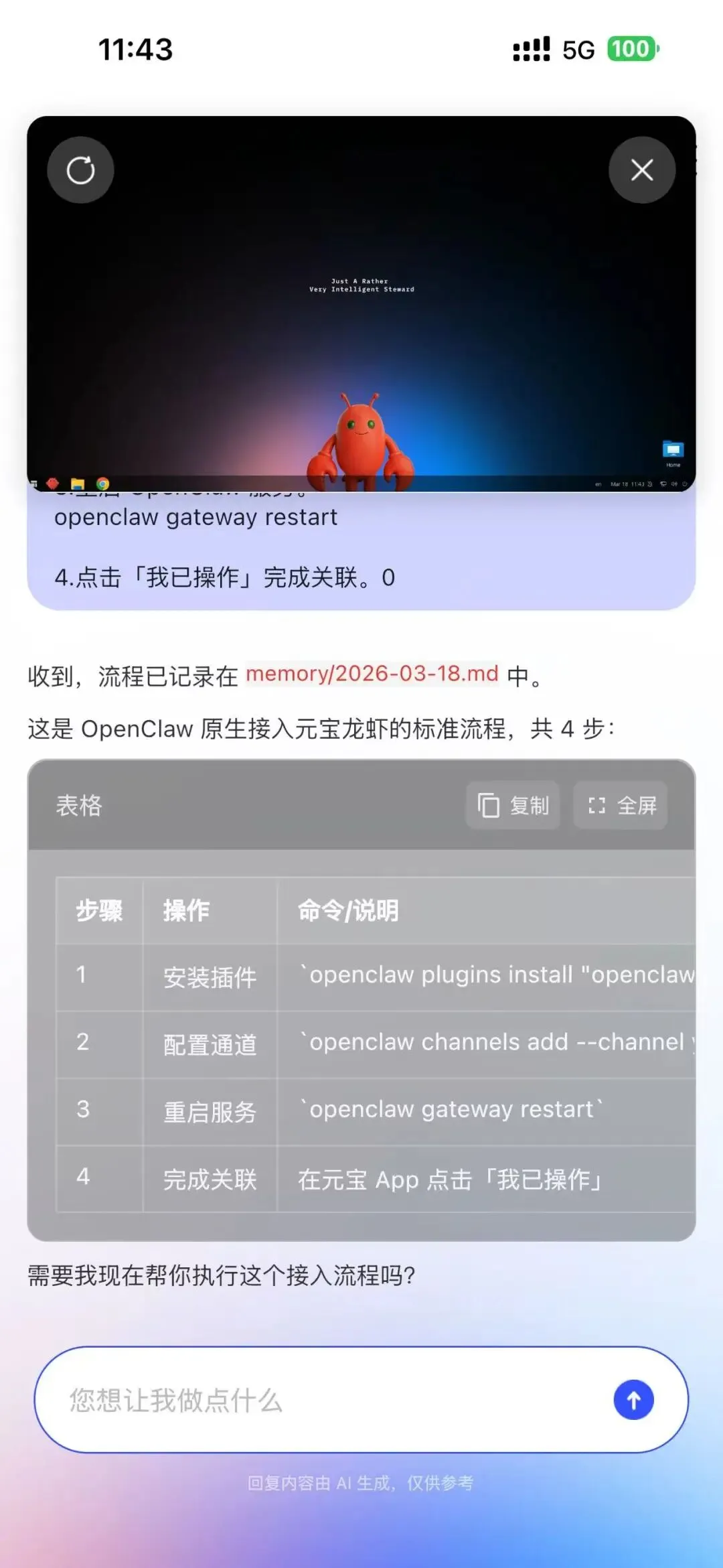 只要你的设备运行了 OpenClaw,就可以轻松接入元宝派!在元宝里面实现集团的效果。