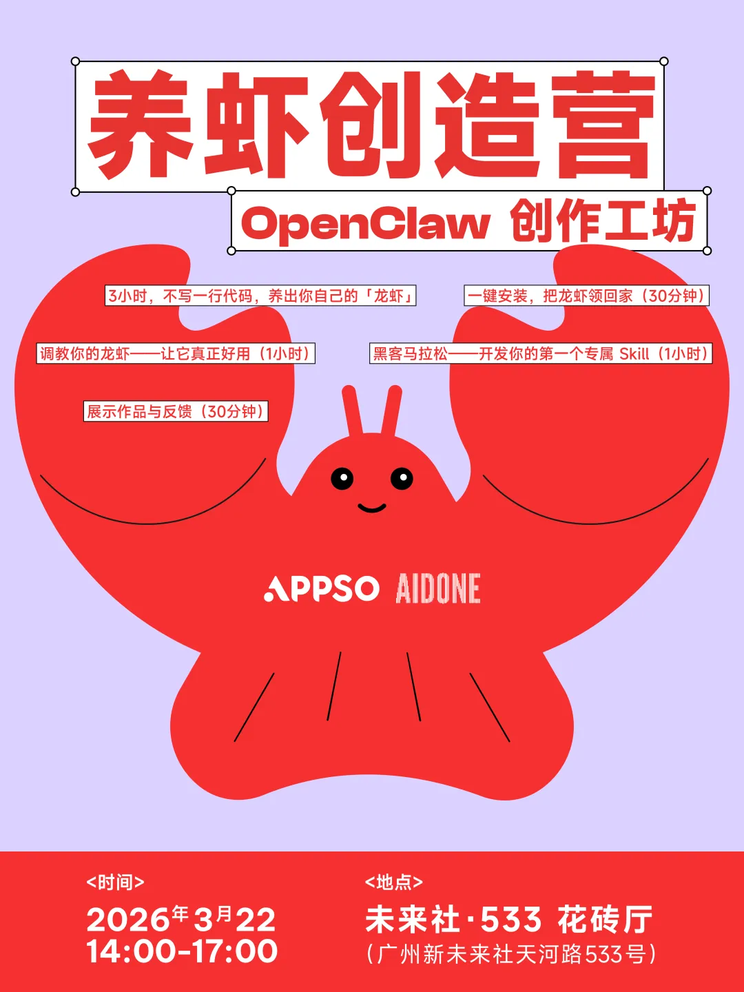 3月22日下午,广州未来社·533。带着你的问题来,带着能用的龙虾走。一起用 OpenClaw,重新定义一个人的可能性。