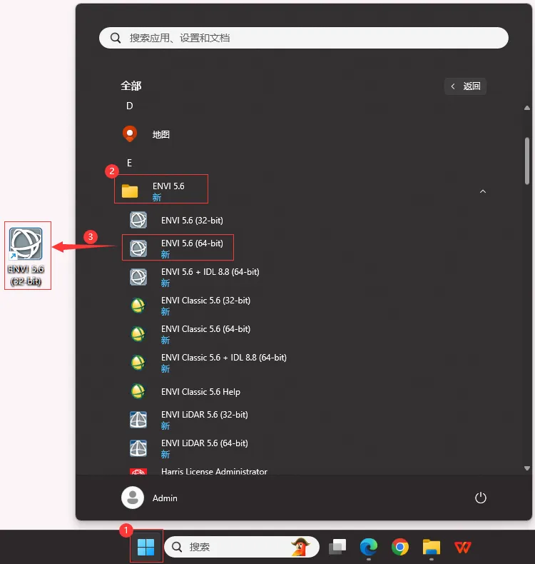 11.创建桌面启动快捷方式:①点击桌面任务栏中的【开始图标】②在所有应用中找到并点击【ENVI 5.6】文件夹③将【ENVI 5.6 (64-bit)】拖到电脑桌面。