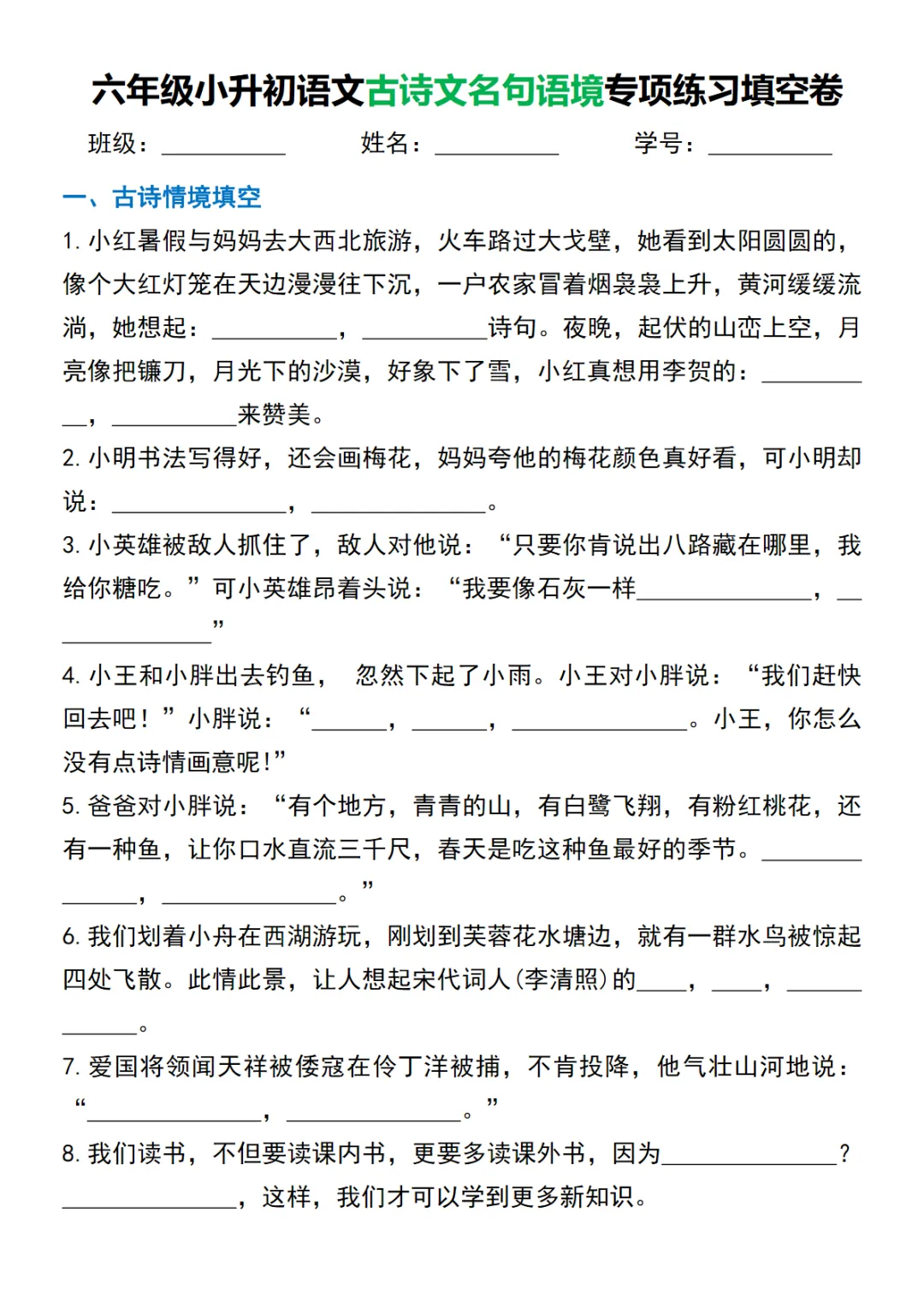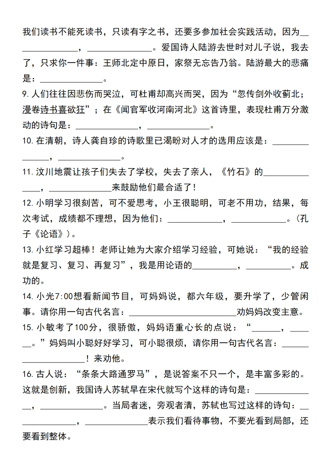 六年级(下)语文 小升初古诗文名句语境默写