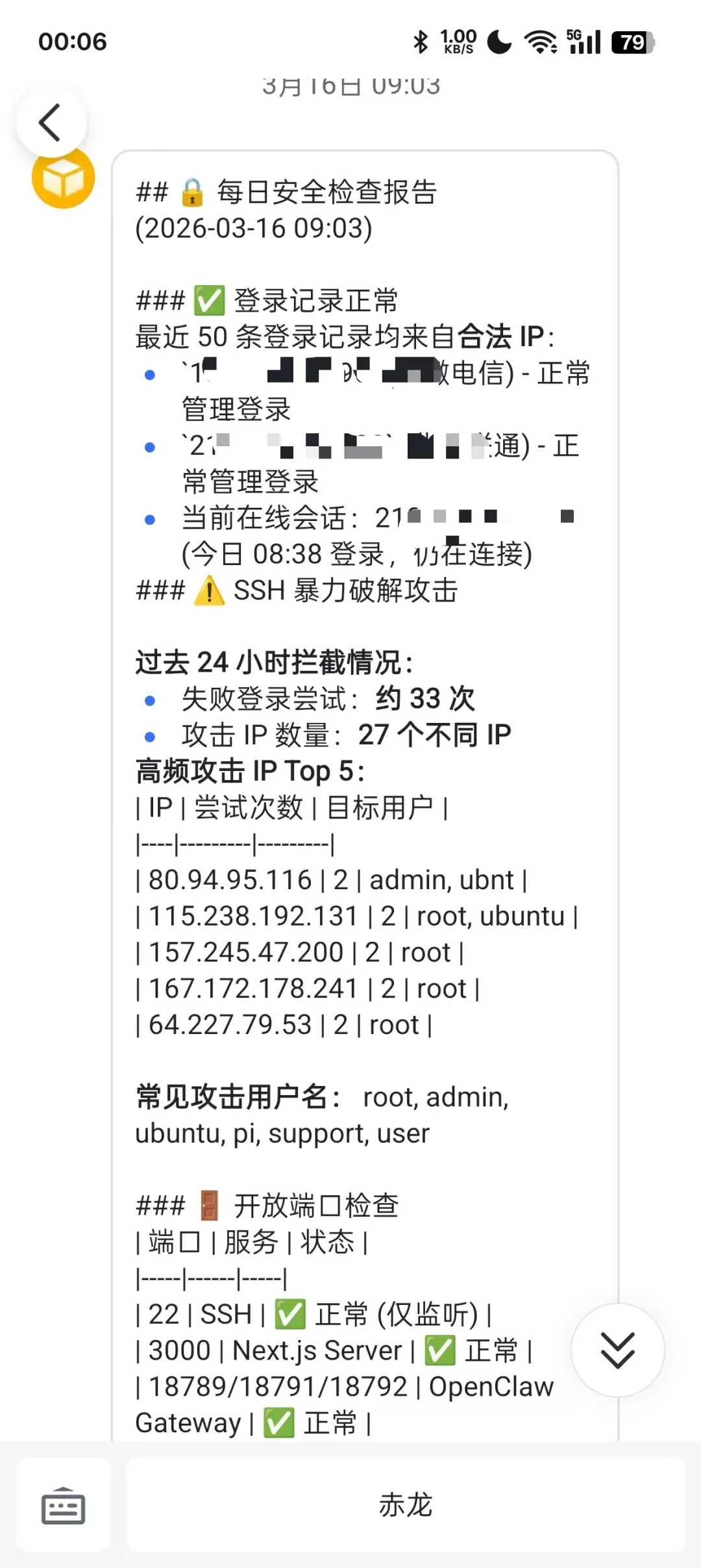 以上安全实践无需手动执行命令,我均通过自然语言交由「龙虾赤龙」完成安装部署、定时任务配置等操作,整体安全防护工作可全权交由龙虾处理。当然我也会备注一下,在确保自身正常运行的情况下进行修改。
