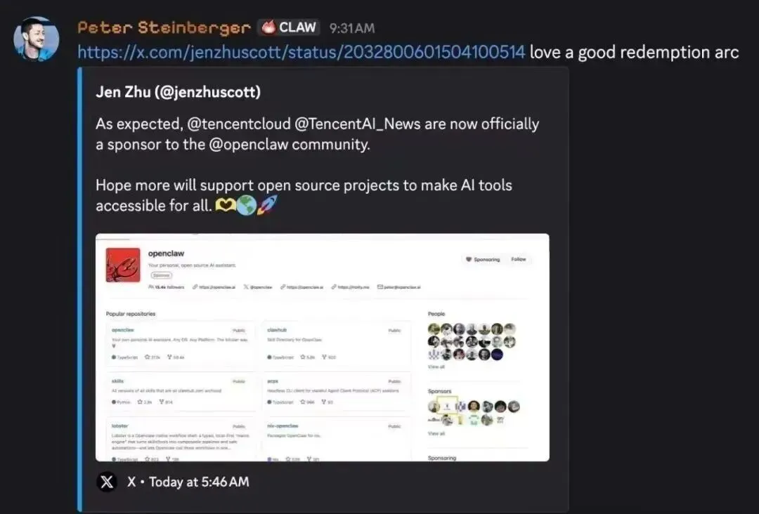 3天反转!腾讯从被OpenClaw创始人怒怼,到正式赞助OpenClaw获赞,终了还是“王总好”最近科技圈最戏剧性的事件,莫过于腾讯与OpenClaw的“爱恨纠葛”——从开源创始人公开炮轰“照搬不支持”,到3天内握手言和、成为官方赞助商,这场反转不仅平息了一场开源争议,更意外揭开了腾讯当前AI战略的核心逻辑。今天我们就来完整梳理这场风波,拆解事件背后的细节,更聊聊这件事折射出的腾讯现状。先理清来龙去脉:一场“误会”引发的3天反转大戏要读懂这场风波,首先得知道OpenClaw是什么——它还有个可爱的昵称“小龙虾”,是2026年初爆火的开源AI智能体框架,由奥地利开发者Peter Steinberger主导,能自主操作电脑、浏览器、文件和脚本,堪称“AI打工人”,开源后GitHub星标迅速突破30万,成为现象级项目。腾讯与它的交集,从一次“本土化镜像”开始,一步步走向争议与和解。Day1:风波起点——腾讯上线SkillHub,埋下争议种子3月11日,腾讯云与腾讯AI联合推出AI技能社区SkillHub,定位是OpenClaw的中国本土化镜像站,宣称能提供1.3万+OpenClaw技能,还有高速下载、中文搜索等本土化服务,页面也明确标注“技能数据来源于ClawHub(OpenClaw官方技能库)”。从规则上看,这是一次常规的开源镜像操作,目的是解决中国用户访问海外源站卡顿、下载缓慢的问题,但腾讯忽略了一个关键——没有提前与OpenClaw官方沟通。Day2:矛盾爆发——创始人公开怒怼,指责腾讯“只拿不养”3月12日,OpenClaw创始人Peter Steinberger在X平台(原Twitter)发文,直接炮轰腾讯。他表示,腾讯未经沟通就全量抓取ClawHub的数据,导致OpenClaw的服务器成本飙升至五位数美元,还直言“他们照搬,却没有以任何形式支持项目”。这番指责迅速在开源圈发酵——开源不等于“免费搬运”,社区最看重的是尊重、沟通和实质性回馈,Peter的愤怒,本质上是觉得腾讯“享受了开源红利,却没有回馈社区”。此时的腾讯,陷入了“合规但不合情”的舆论困境。Day2-Day4:腾讯快速回应,用行动化解争议面对指责,腾讯没有陷入“抄没抄”的口水战,而是用数据和行动快速破局,回应要点很明确,也很有说服力:1. 定性合规:SkillHub是合法镜像站,全程标注来源,并非抄袭,完全符合OpenClaw的MIT开源协议;2. 数据证清白:SkillHub上线首周,为用户分发了180GB流量(对应87万次下载),但从OpenClaw官方源仅拉取了约1GB数据——也就是说,腾讯不仅没增加官方服务器负担,反而分担了99%以上的中国区流量压力;3. 亮出诚意:腾讯多名工程师早已是OpenClaw的活跃代码贡献者,并非“只拿不用”;同时主动提议,愿意成为OpenClaw官方赞助商,提供资金和云资源支持。Day5:反转落地——正式成为赞助商,创始人直言“救赎剧情”3月15日,这场风波迎来戏剧性结局:Peter Steinberger在X平台转发官宣消息,确认“腾讯云与腾讯AI正式成为OpenClaw项目的官方赞助商”,GitHub Sponsors页面也同步更新,腾讯(轻量云)与OpenAI、百度并列出现。Peter还俏皮地配文“Love a good redemption arc”(就爱看这种救赎剧情),彻底放下芥蒂。至此,一场开源争议,变成了一次双赢的合作。事件之外:透过这场合作,看腾讯很多人把这场反转看作腾讯的一次“危机公关胜利”,但其实,这背后是腾讯当前发展状态的真实缩影——不再追求“闷声发大财”,而是以更开放、更务实的姿态,深耕AI生态,补齐自身短板,巩固核心优势。从被怒怼到成为赞助商,这3天的反转,与其说是腾讯的“救赎”,不如说是它转型的一个缩影。如今的腾讯,早已不是那个只靠社交和游戏的互联网巨头:它在AI领域持续加码,2024年研发投入达706.9亿元,累计投入超3400亿元,专利数量超4.5万件;当然,腾讯也面临着挑战:微信超级智能体的技术成熟度、生态合作方的利益平衡、AI安全的持续防控,都是它需要解决的问题。但不可否认的是,这场与OpenClaw的合作,让我们看到了一个更开放、更务实、更有野心的腾讯。你怎么看腾讯赞助OpenClaw?你期待微信超级AI智能体的落地吗?欢迎在评论区留言讨论~关注我,带你看透科技圈热点背后的商业逻辑✨