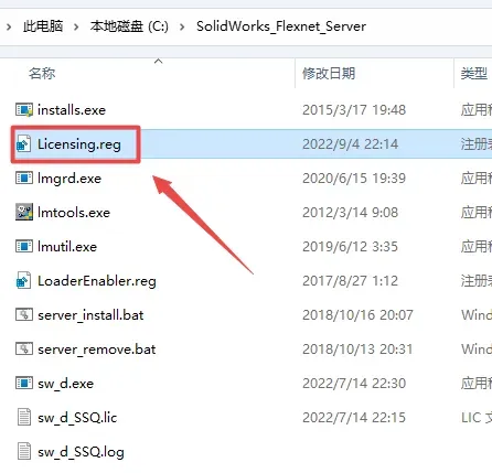 8、再返回“SolidWorks_Flexnet_Server”文件夹,双击”Licensing.reg“注册表文件