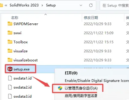11、返回解压的”SolidWorks 2023“文件夹,双击打开“Setup”文件夹,鼠标右键点击“Setup.exe”选择“以管理员身份运行”
