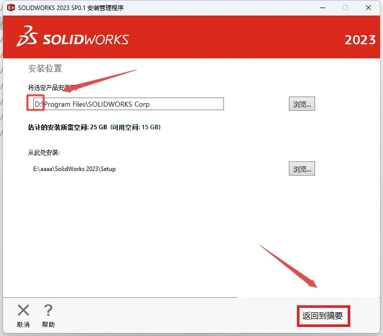 19.建议安装到D盘(将路径地址中的首字符C改为D表示安装到D盘,安装路径不要出现中文),点击”返回到摘要“