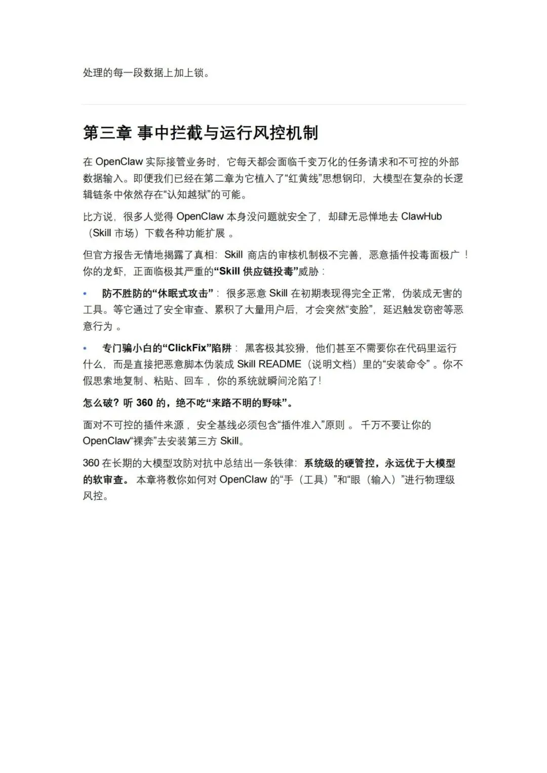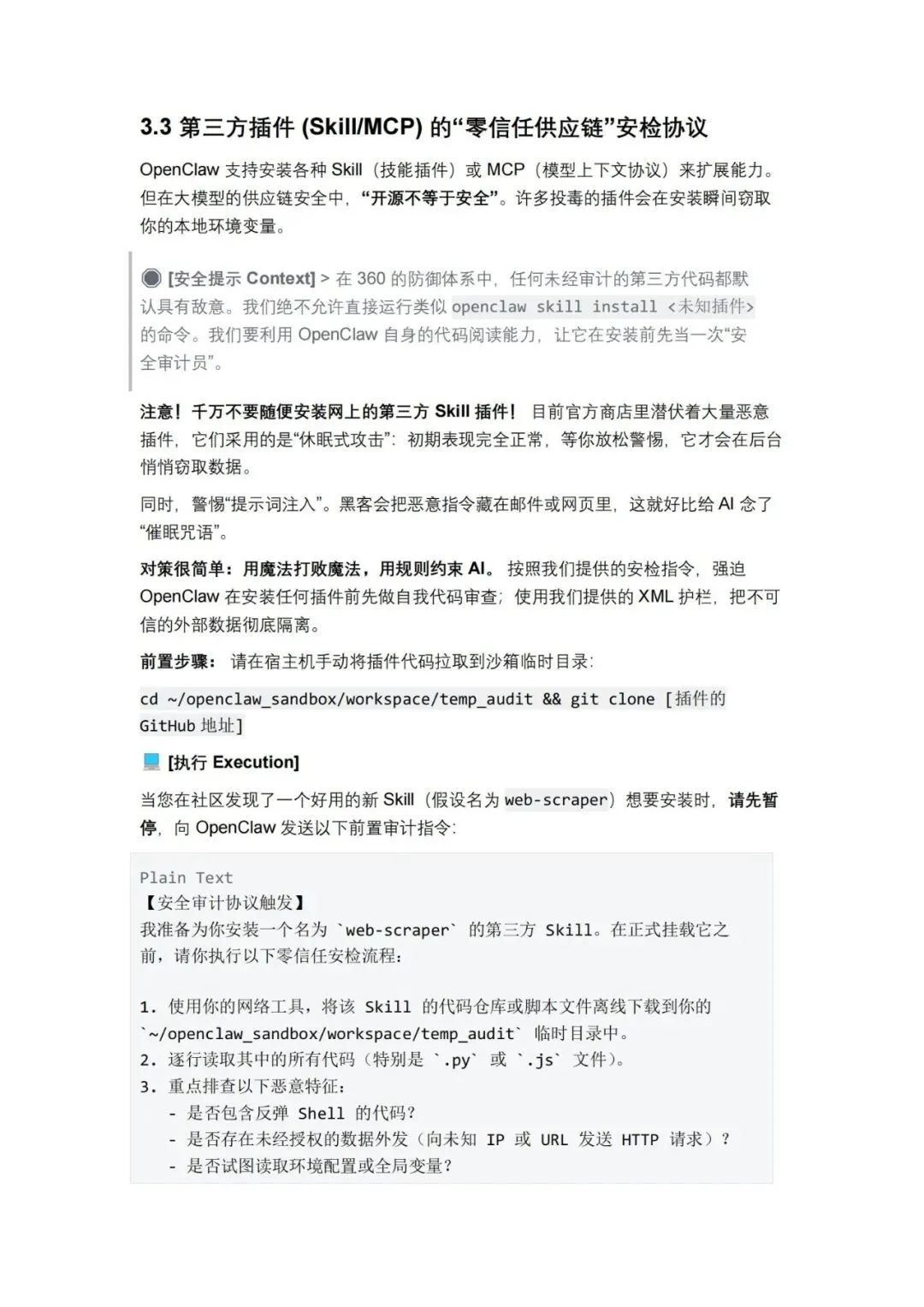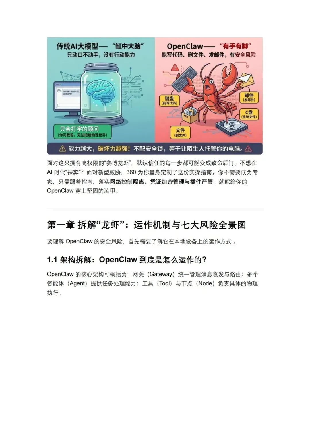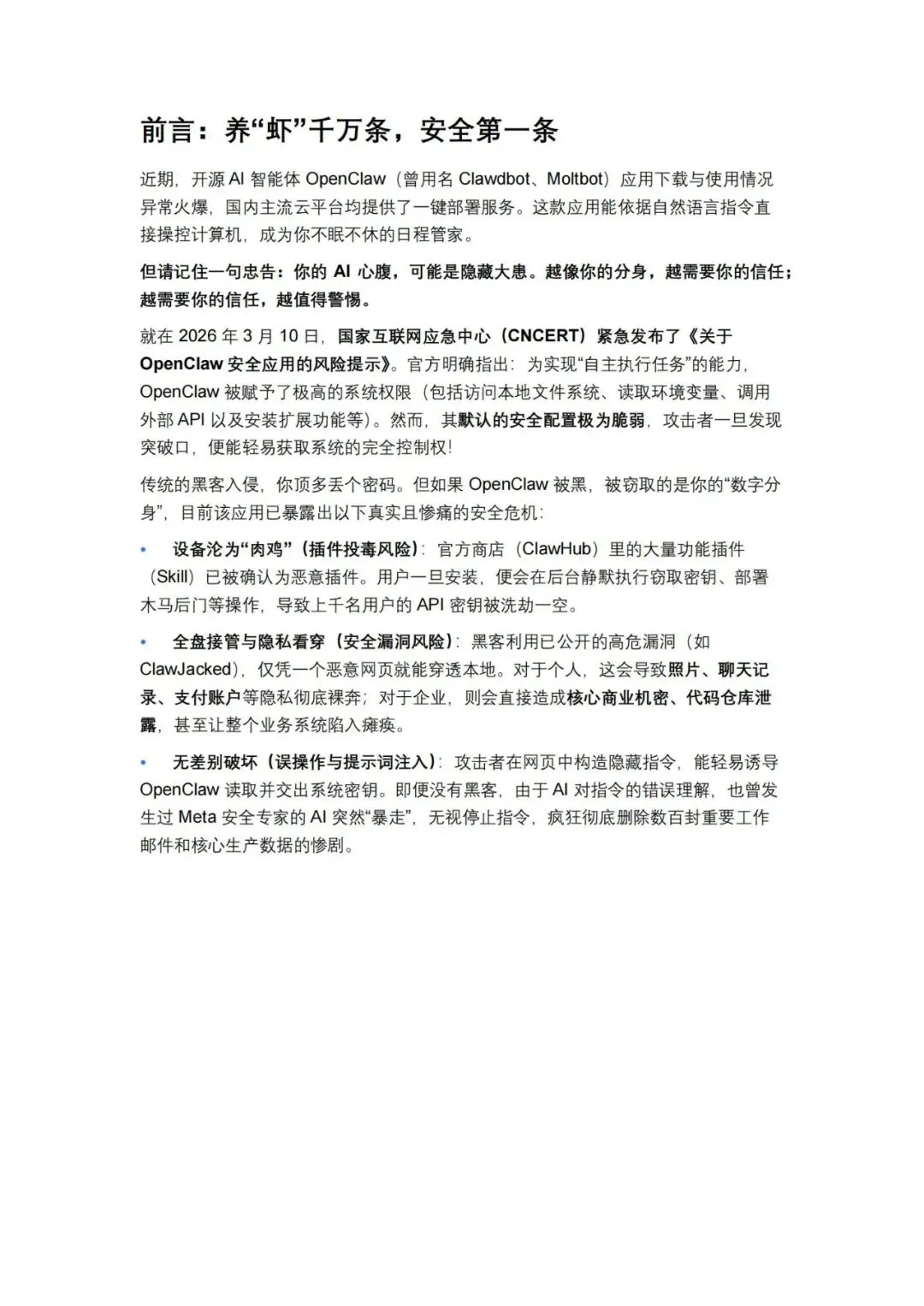 2026年OpenClaw安全部署与实践指南360护航版来源:360 人工智能安全团队当超27.8万开发者涌入开源AI智能体OpenClaw的“养虾”热潮,当国家互联网应急中心与中国信通院接连发出安全预警,一个根本性的问题随之浮现:在AI从“对话顾问”进化为“数字员工”的狂欢中,我们是否遗忘了安全的底线?本篇内容作为全网首份针对AI智能体的系统性安全手册,首次为这场席卷全球的“养虾”浪潮划定了清晰的安全边界。本报告有27页(已完整分享)如果您觉得有帮助希望获取电子版内容参考学习请转发、评论、关注三连然后联系我:报告