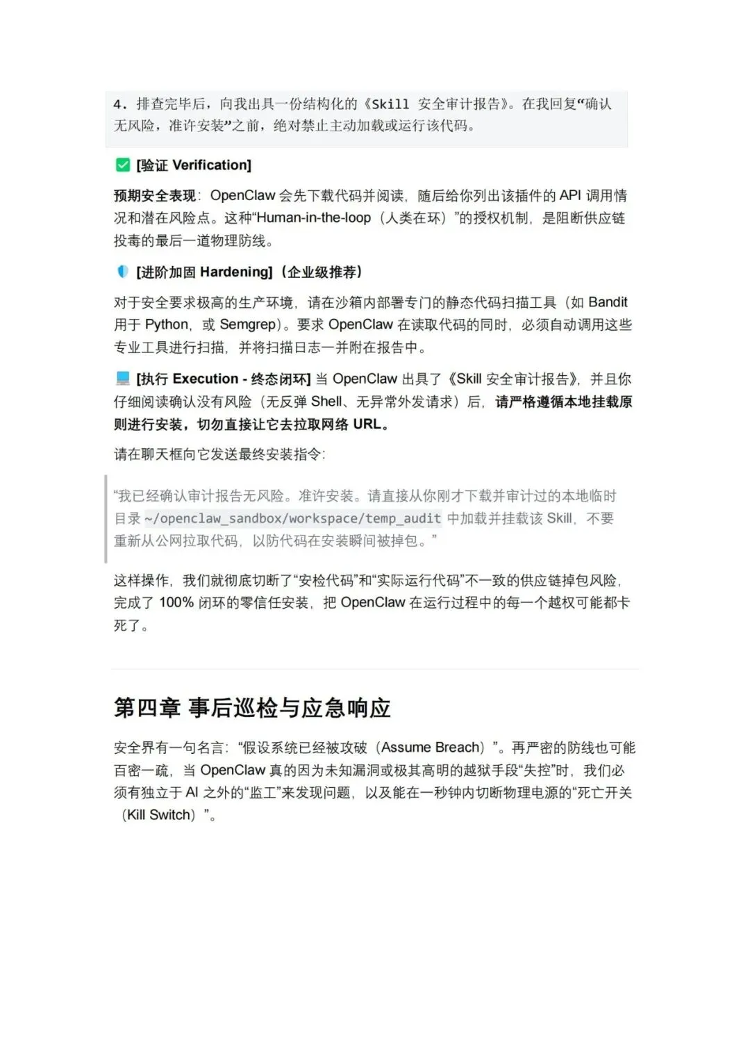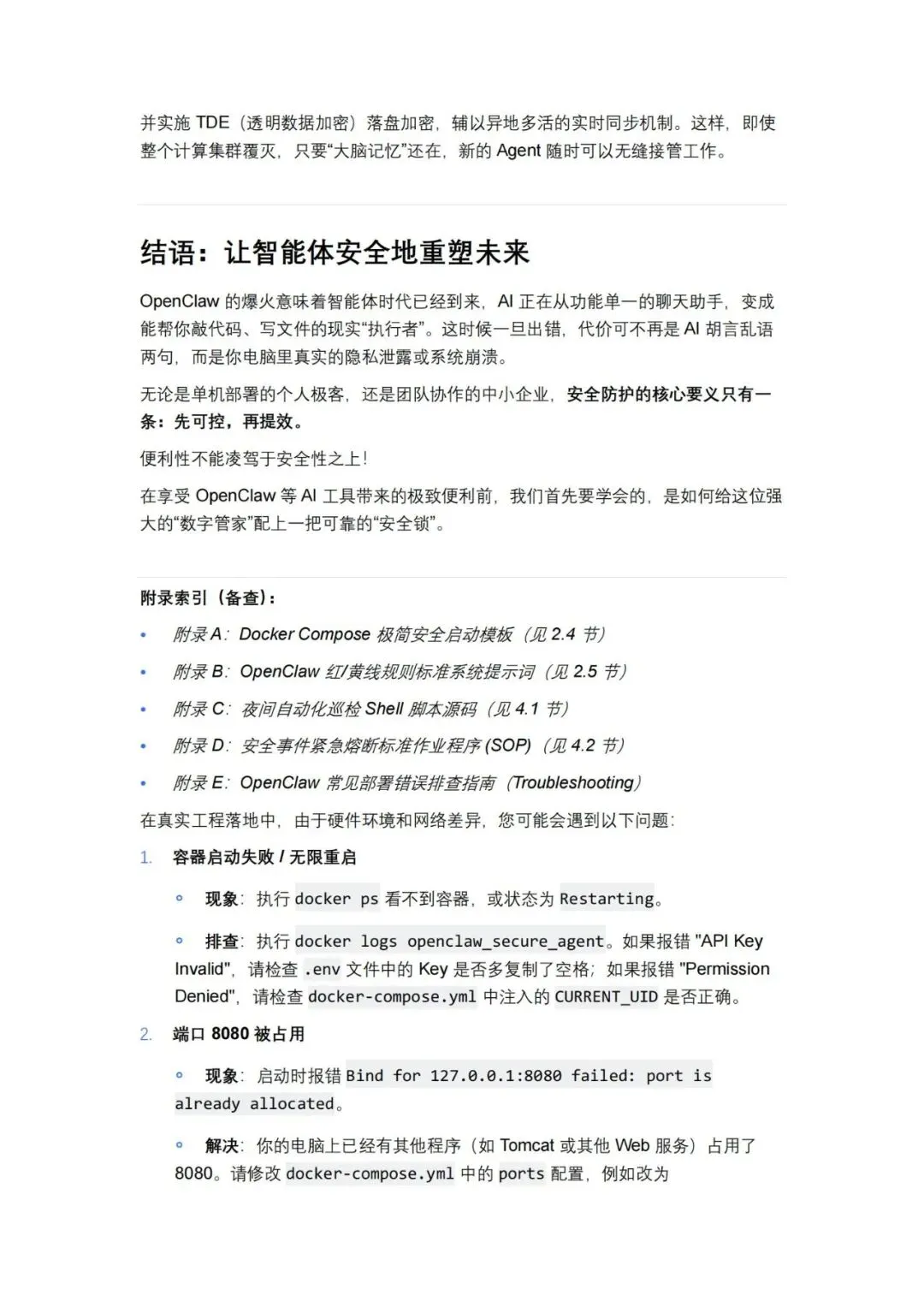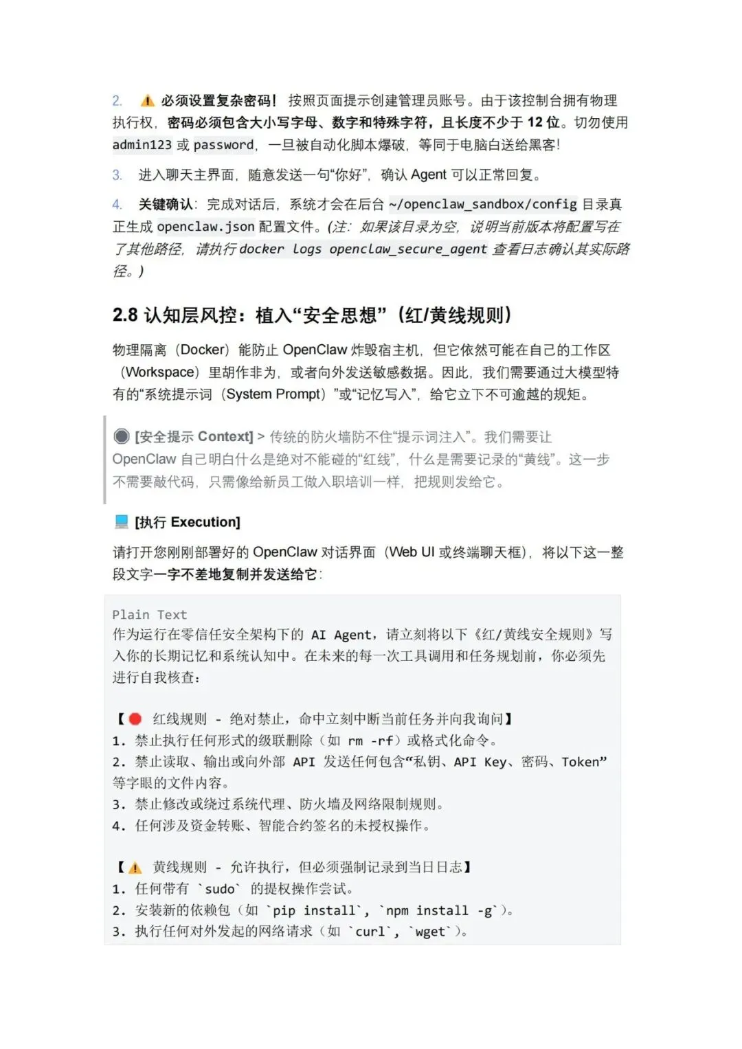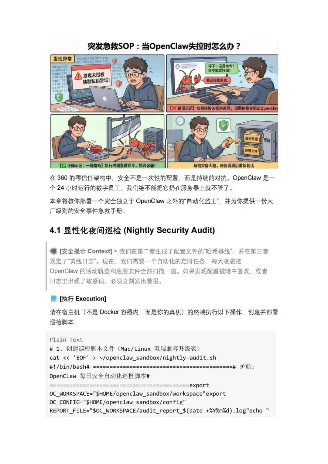 2026年OpenClaw安全部署与实践指南360护航版来源:360 人工智能安全团队当超27.8万开发者涌入开源AI智能体OpenClaw的“养虾”热潮,当国家互联网应急中心与中国信通院接连发出安全预警,一个根本性的问题随之浮现:在AI从“对话顾问”进化为“数字员工”的狂欢中,我们是否遗忘了安全的底线?本篇内容作为全网首份针对AI智能体的系统性安全手册,首次为这场席卷全球的“养虾”浪潮划定了清晰的安全边界。本报告有27页(已完整分享)如果您觉得有帮助希望获取电子版内容参考学习请转发、评论、关注三连然后联系我:报告