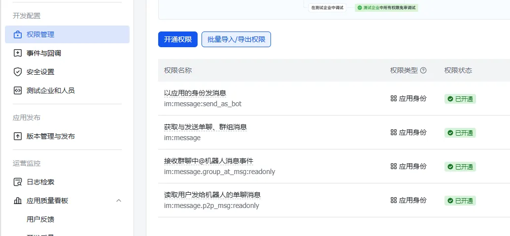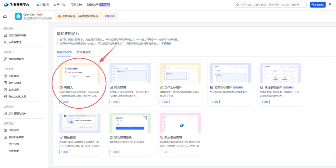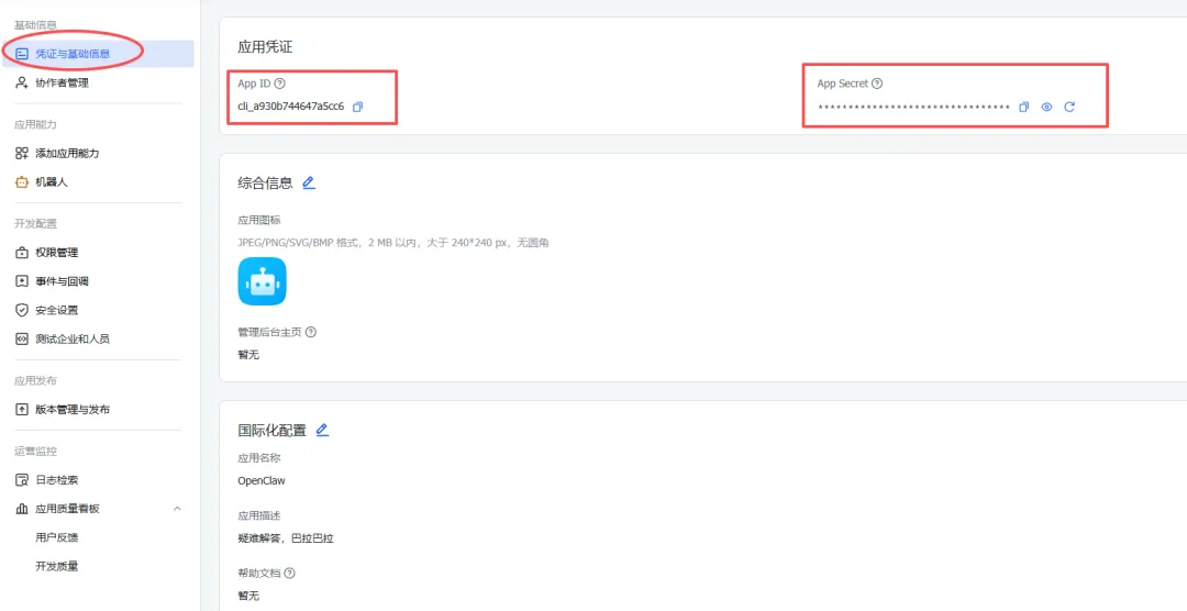 那么,就开启我们今天的OpenClaw+飞书的融合之旅吧!连接 OpenCLaw 和飞书后,你可以在一个地方接收来自各个平台的消息,不用再频繁切换应用。内置 AI 大模型,有什么问题直接问,帮你查资料、写文案、整理思路,就像有个“万事通”同事随时在线。支持文档读取、图片识别、文件管理等能力,帮你快速处理各种工作文件。你可以根据自己的需求,配置不同的机器人角色、回复规则、触发条件,让它真正成为“你的”助手。首先上网搜索飞书,然后用手机号注册一个飞书账号,然后用该账号登录飞书开放平台。飞书开放平台的地址:https://open.feishu.cn/然后会看到这么一个页面,左侧选“添加应用能力”,在“按能力添加”下面,选“添加机器人”。接下来进入“权限管理”,点击“开通权限”,开通下图的四个权限:再然后进入“版本管理与发布”,“创建版本”,填好应用版本号和更新说明之后,就可以发布了。最后再进入“凭证与基础信息”,复制好你的App ID和App Secret。* Select a channel| Telegram (Bot API)| WhatsApp (QR link)| ...| > Feishu/Lark (飞书) (configured)| ...| Finished