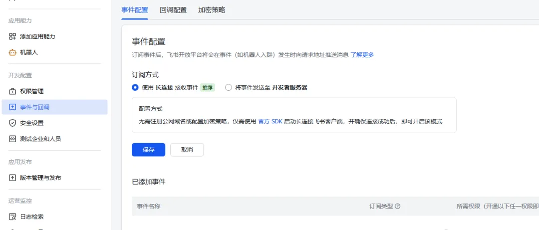 然后输入你的App ID和App Secret,其余选项全默认就行,一路Enter。再回到飞书开放平台,进入“事件与回调”,在事件配置中,选择订阅方式为长连接,然后保存。在下面的已添加事件中,添加事件“im.message.receive_v1”。然后进入“版本管理与发布”,发布新版本(因为你做了上面的改动,所以需要更新版本才能使用新功能)。OpenClaw: access not configured.Your Feishu user id: <飞书id>Pairing code: <配对码>Ask the bot owner to approve with: openclaw pairing approve feishu <配对码>