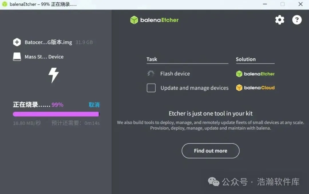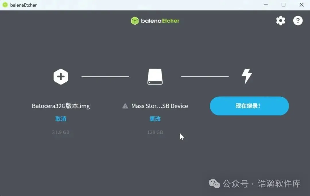 2. 刻录镜像:打开刻录工具,选择下载的Batocera镜像文件,选定目标U盘,点击刻录按钮,等待完成后安全弹出U盘(注意刻录会清空U盘数据)。