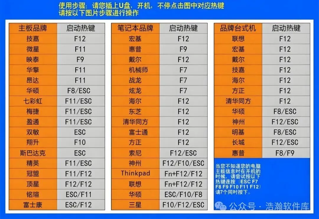 然后重启电脑,反复点击启动盘选择快捷键,不同的主板快捷键有所不同,大家可以根据这张图片对应选择。
