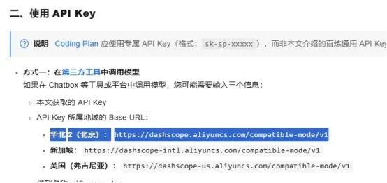 登录 阿里百炼平台,点击 API 参考,找到 API Key 中的 华北 2(北京) base_url: