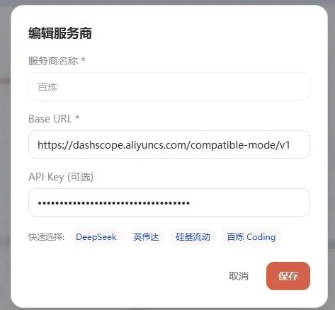 打开 OpenClawSwitch,进入 模型配置 → 服务商 → 添加,将上面的信息填写到对应位置。服务商名字可以简单写(随意)。