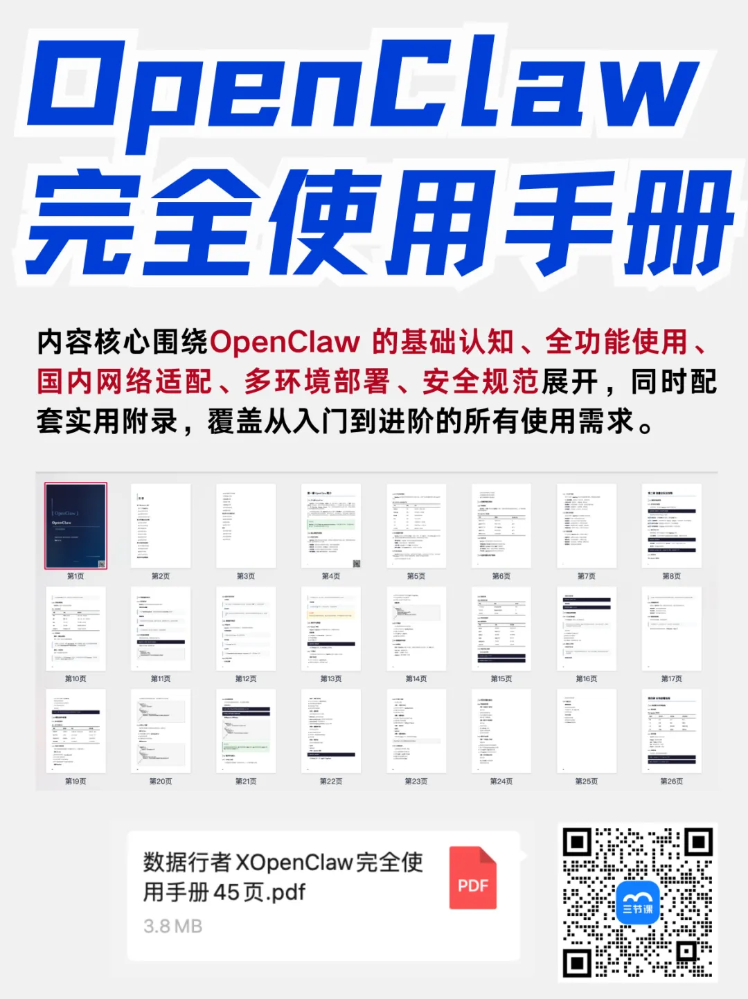 三节课直接把 OpenClaw 全套学习方案整理好了,内容覆盖0 基础入门→实战进阶→技术原理三大阶段,带你一站式学透OpenClaw: