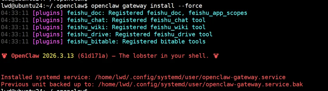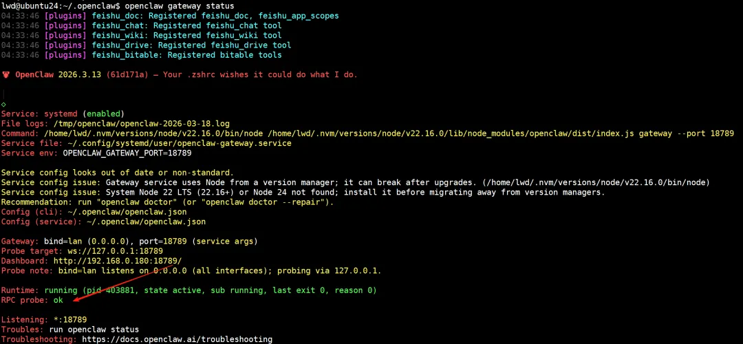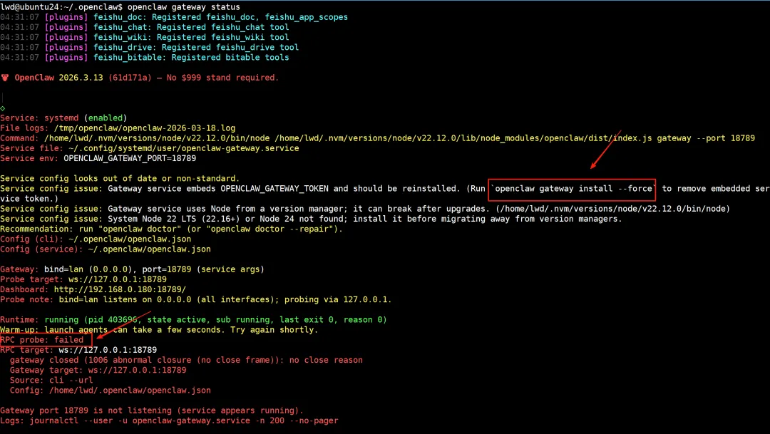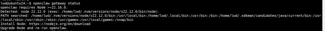三、重新安装最新版本的openclaw1、我其实并不清楚接下去需要重新安装openclaw,探索了一下,先检查一下node 升级后openclaw的状态:lwd@ubuntu24:~/.openclaw$ openclaw --versionopenclaw: command not foundlwd@ubuntu24:~$ openclaw gateway statusopenclaw: command not found
