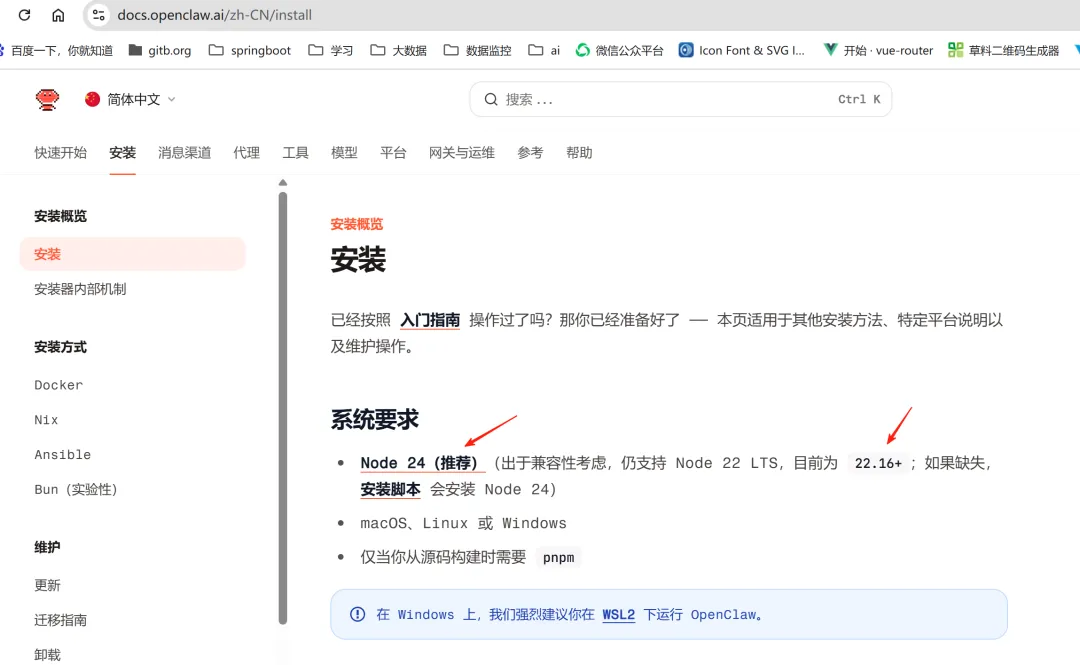 22.16+,所以只能升级Node 版本,才能升级新版的openclaw。提示:遇到问题,查找官方文档,才是最正确的解决路径之一。