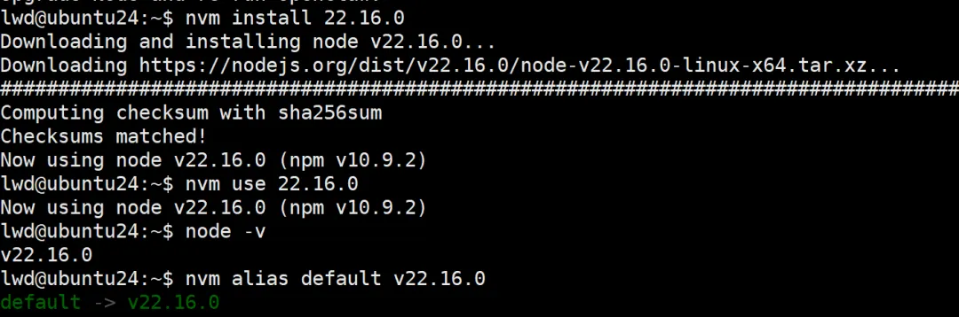 二、升级Node 版本# 安装 24.11.0(当前最新稳定版)nvm install 22.16.0# 切换并设为默认版本nvm use 22.16.0nvm alias default 22.16.0