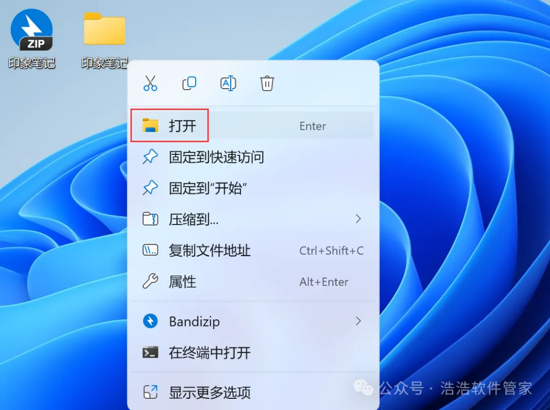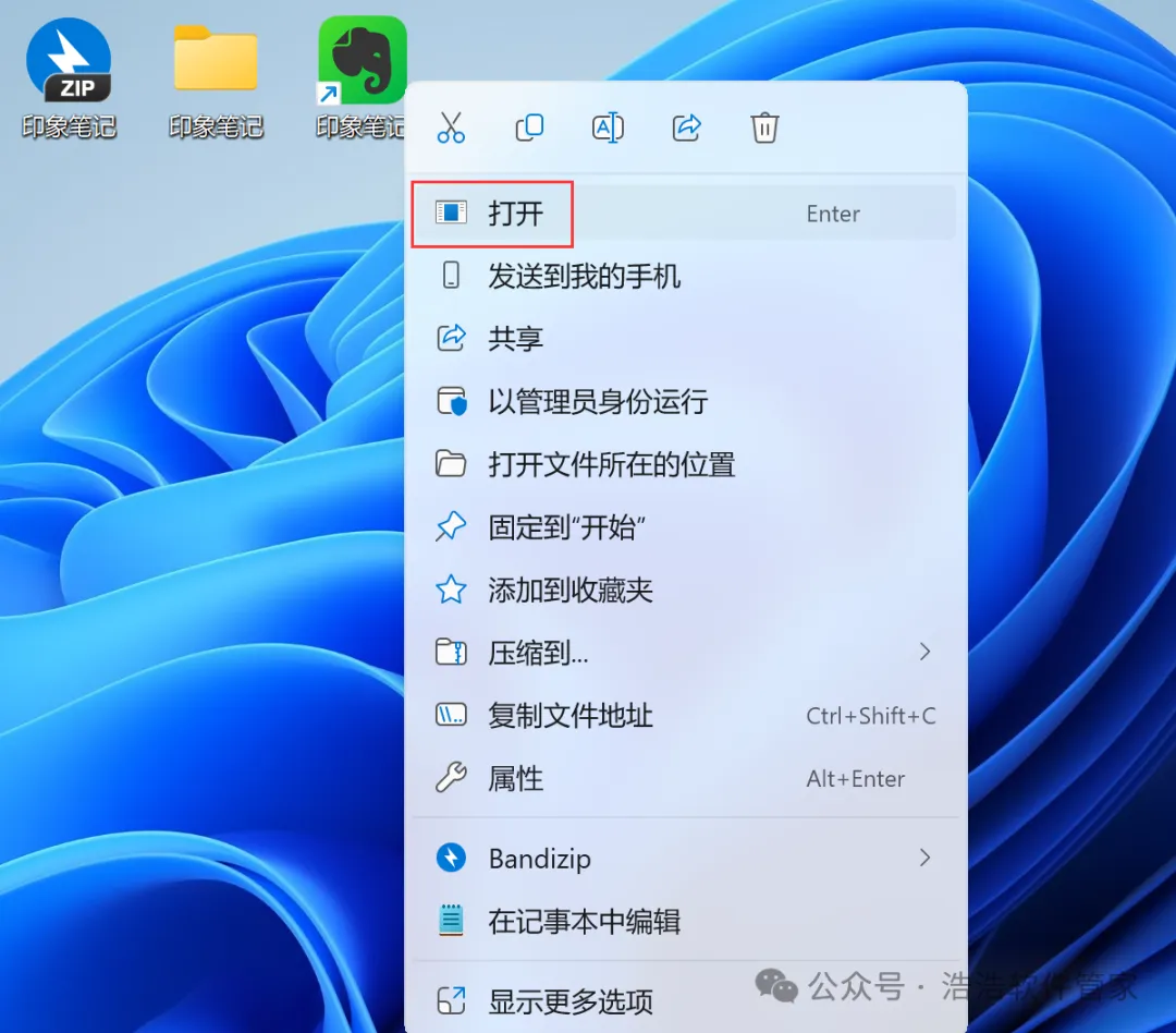 7、回到桌面,右键桌面上的【印象笔记软件图标】,点击【打开】