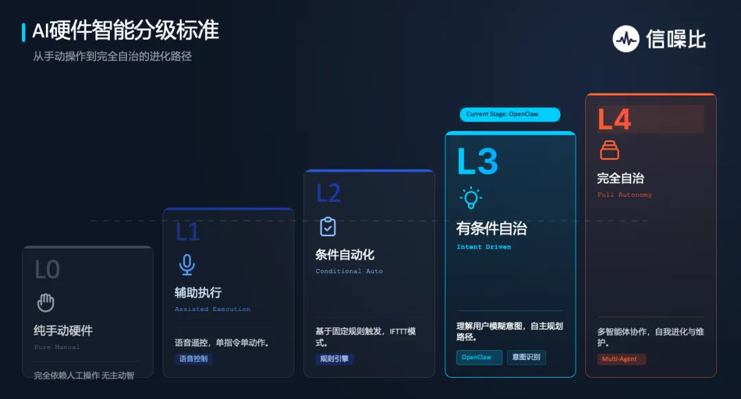 为了厘清这条演进路线,Wayne参照智驾的发展,现场抛出了一套极其清晰的「AI硬件智能分级标准」: