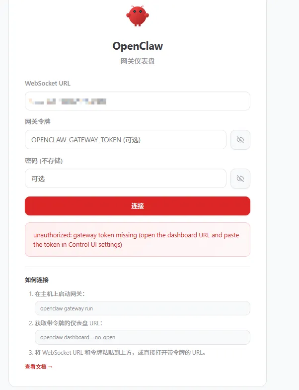 网关令牌输入token即可登入。token可在docker启动日志中找到。