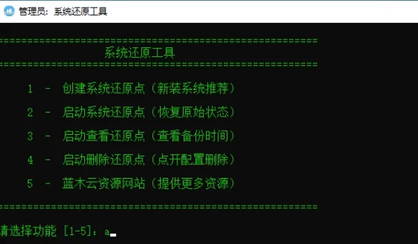 ====================================================== 系统还原工具 =========================================================== 1 - 创建系统还原点(新装系统推荐) 2 - 启动系统还原点(恢复原始状态) 3 - 启动查看还原点(查看备份时间) 4 - 启动删除还原点(点开配置删除)======================================================